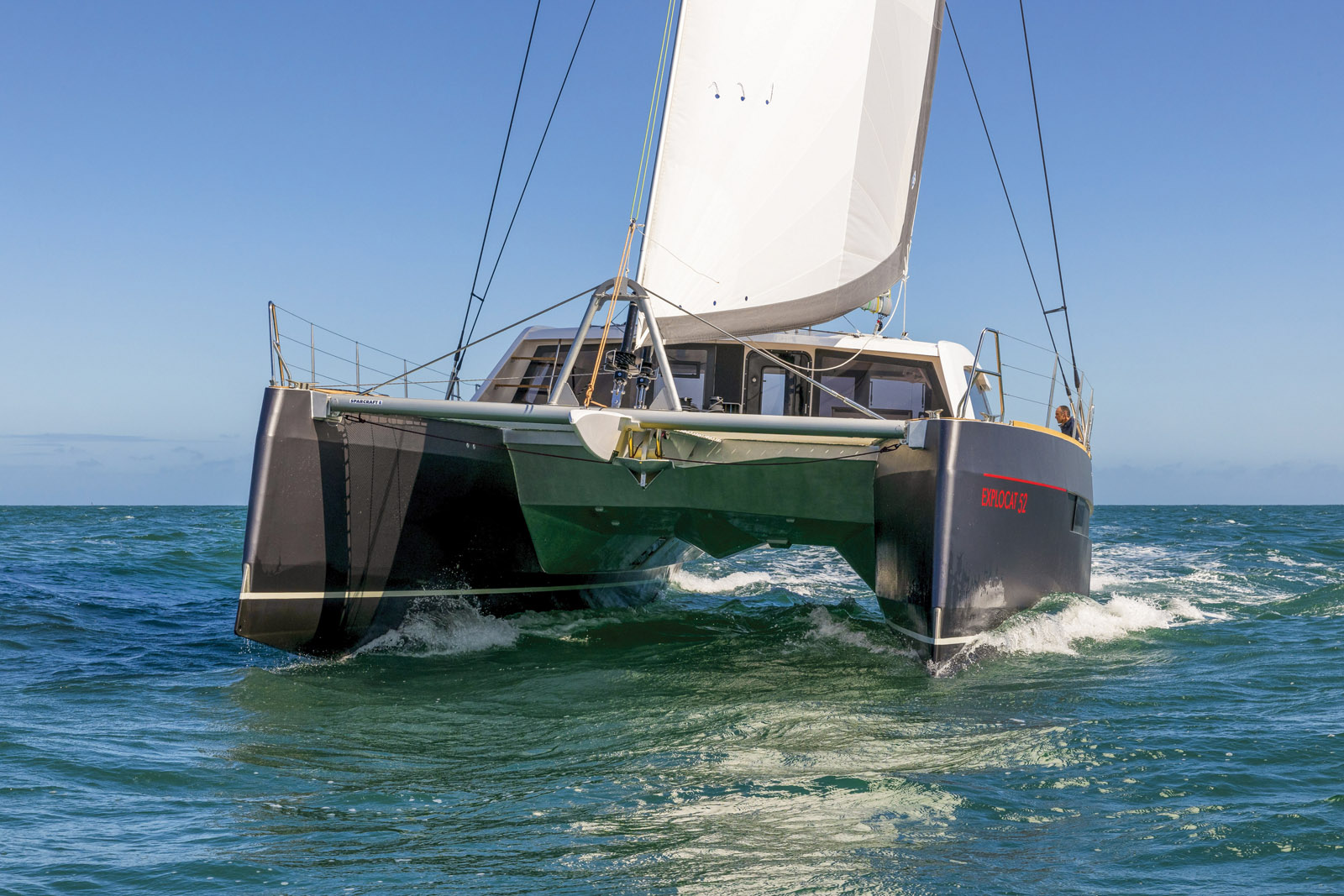 Les moteurs sont mis en route, nous quittons le port de commerce de Cherbourg. Attention à tenir fermement la barre en marche arrière. Les deux moteurs Volvo de 75 CV (60 CV en standard) nous décollent du ponton sans forcer, malgré le vent contraire. Petite entorse à la doctrine Garcia, des saildrives d’hélice ont été exceptionnellement préférés aux traditionnels arbres d’hélice. Plus compacts et donc mieux adaptés à la trame d’aménagement d’un multicoque, ils sont protégés par des ailerons soudés sous la coque. Les safrans comportent quant à eux une partie sacrificielle qui garantit l’intégrité de la coque en cas de choc. Les commandes électriques des moteurs manquent un peu de progressivité et le toucher de barre est trop ferme à notre goût, mais ce n’est qu’une question de réglages. Bout au vent, la grand-voile est hissée depuis le cockpit avant. On y est très bien protégé. Au-delà de la traditionnelle fonction farniente, ce sera un spot idéal pour surveiller les growlers ou encore manœuvrer le mouillage principal (jusqu’à 100 m de chaîne !) dans les baies les plus isolées. Génois déroulé, l’Explocat 52 se déhale doucement dans une faible brise alors que nous sommes encore protégés par la digue de la grande rade. Une fois en pleine mer, la brise s’établit à une petite quinzaine de nœuds. Nous sommes alors plus qu’agréablement surpris par les sensations. Un ressenti vite confirmé en chiffres : par 15 nœuds de vent, à 63 degrés du vent réel, le bateau file ses 9 nœuds sans peine. On montera même jusqu’à 55 degrés. Mais au près, on perd vite 1 à 2 nœuds et on se prend à relancer pour retrouver de la vitesse. Les ailerons fixes (1,50 m de tirant d’eau) ne font pas du 52 une bête de louvoyage, mais ne grèvent pas non plus irrémédiablement les performances. Par rapport à des dérives, ils ont l’avantage d’être plus légers, de ne pas encombrer les aménagements, et enfin d’être résistants aux éventuels chocs et aux échouages. En résumé, un choix encore une fois tout à fait logique au regard des navigations envisagées.