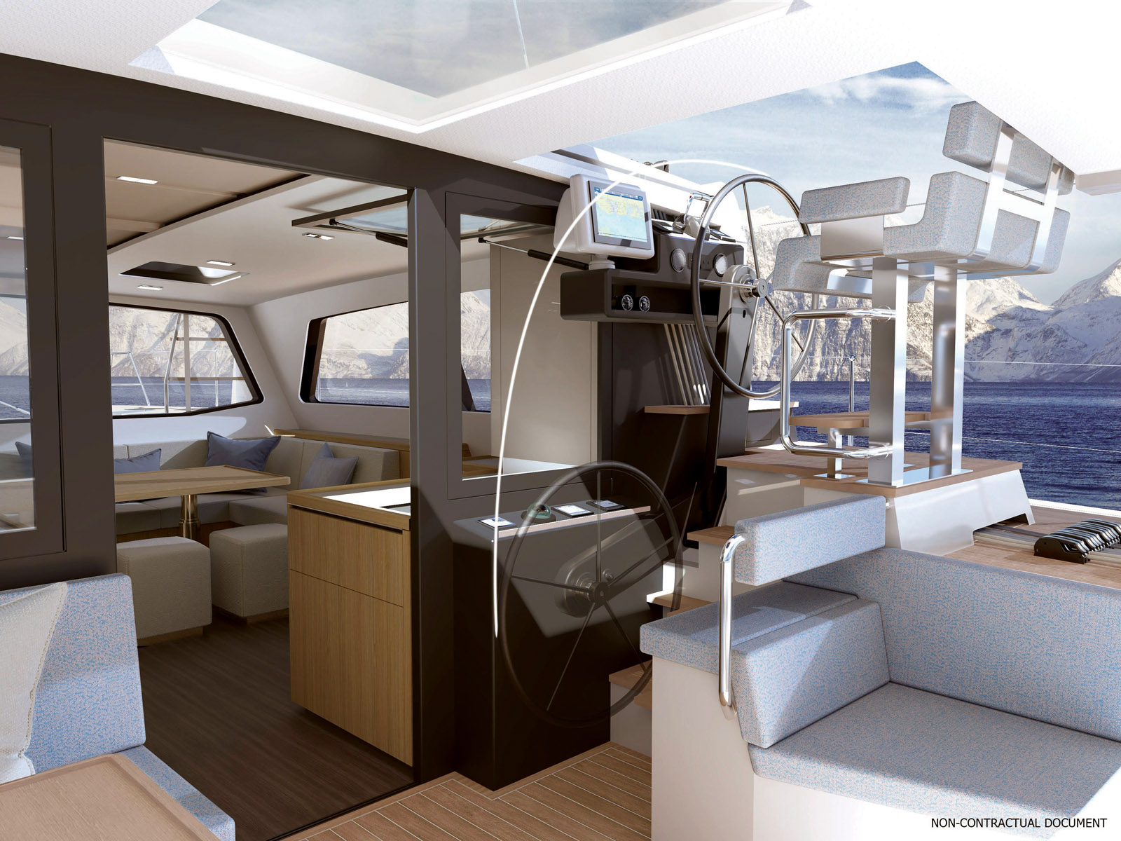 Les deux postes de barre sont une demande du propriétaire de ce premier exemplaire. Le constructeur prévoit en effet un poste de barre contre le rouf.