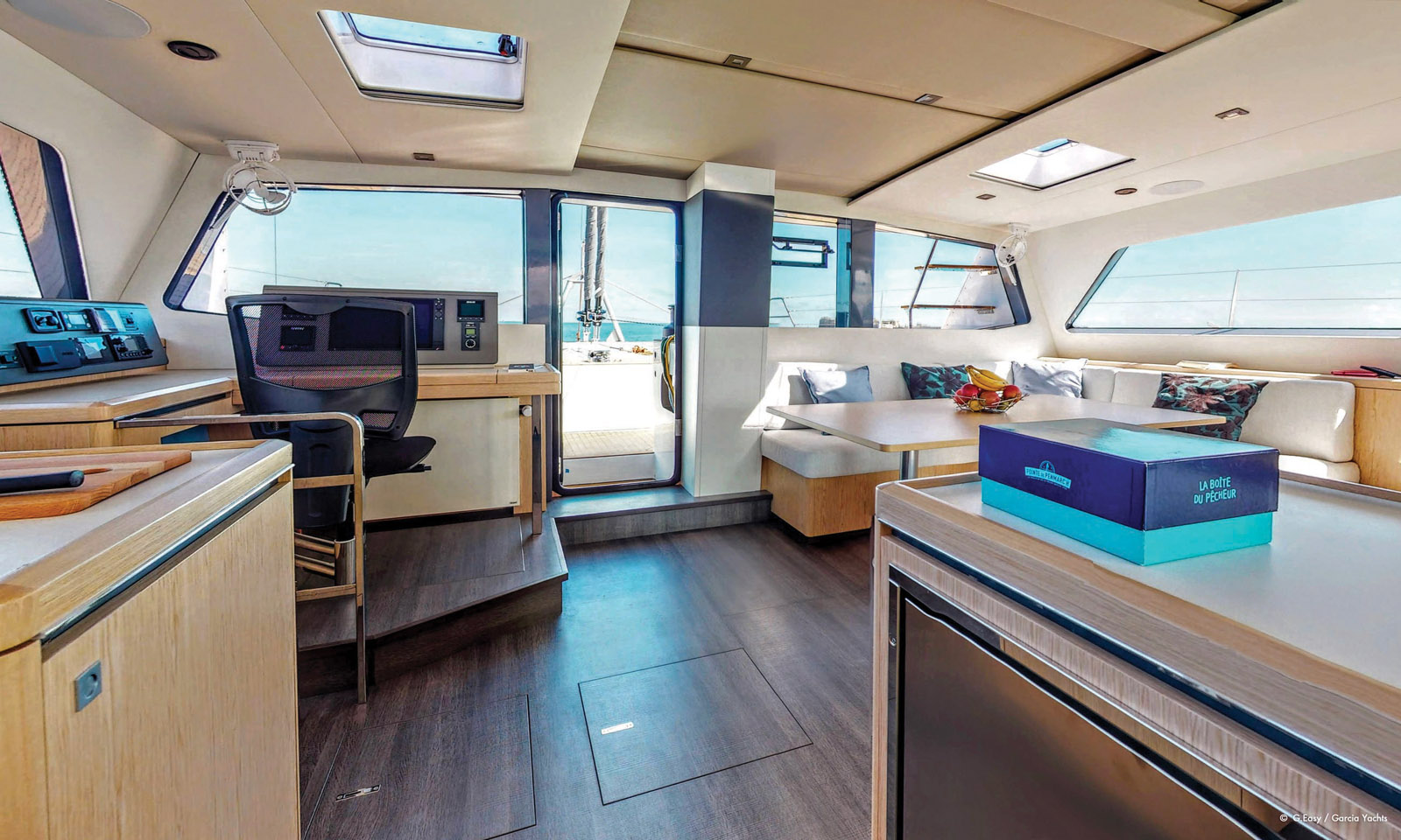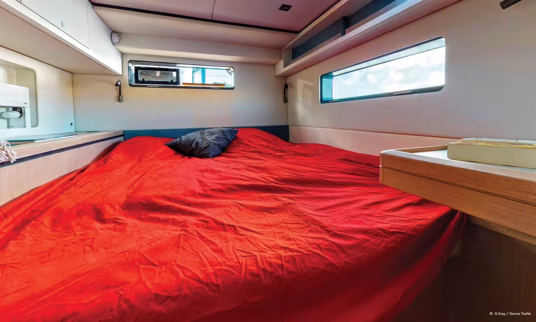 Avant d’abattre et de taquiner les 10 nœuds dans un vent mollissant, nous jetons un coup d’œil aux systèmes installés avec soin : circuits clairs, fixations, marquages, passes-coque soudés remontant au-dessus de la flottaison... Rien de révolutionnaire, chez Garcia, on privilégie toujours l’expérience plutôt que l’innovation à tout prix. Priorité aux solutions fiables, solides. Seules concessions pertinentes au XXIe siècle et au diktat de la balance, les batteries adoptent la technologie lithium. Les panneaux solaires, quant à eux, peuvent cumuler jusqu’à 2 kW de puissance. Il faut dire qu’entre dessus de roof – seule partie en polyester du bateau – et bossoirs, il y a de la surface disponible ! Dans les coques, le silence est surprenant, bénéfice indirect de l’isolation thermique qui rend aussi service à l’acoustique. A tribord, la suite propriétaire occupe toute la longueur. Entre rangements multiples, sofa détente, grande salle d’eau avec toilettes séparés, machine à laver 7 kg, cabine de douche XXL et même bureau, il y a plus d’espace que dans un studio parisien ou new-yorkais ! A moins que vous n’optiez pour quatre cabines, la coque bâbord est dédiée aux invités, avec plusieurs combinaisons de salles d’eau, douches et WC possibles.