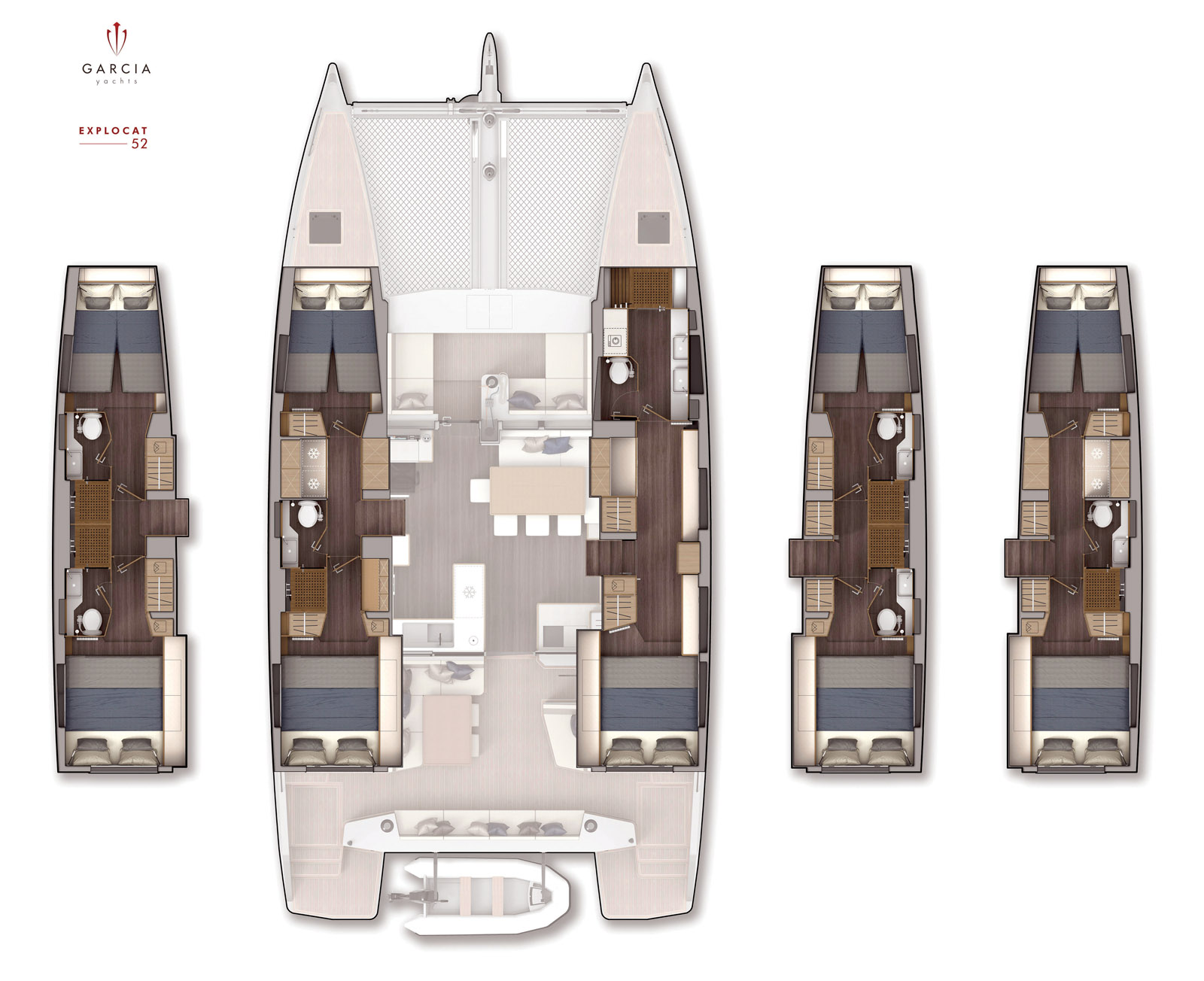 Constructeur de bateaux en aluminium à la réputation mondiale, Garcia ne pouvait plus longtemps se passer d’un multicoque. Il fallait un prolongement à la gamme monocoques, dont la dénomination « Exploration » résume en un mot le programme. L’Explocat 52 est donc un baroudeur de la même trempe. Il a pour ambition d’élargir le terrain de jeu des catamarans de grande série en polyester : il offre la possibilité de s’aventurer plus nord et/ou plus sud. Outre la sécurité apportée par les qualités mécaniques de l’aluminium, l’Explocat 52 bénéficie d’une conception et d’options qui lui permettent de s’aventurer partout, ou presque.