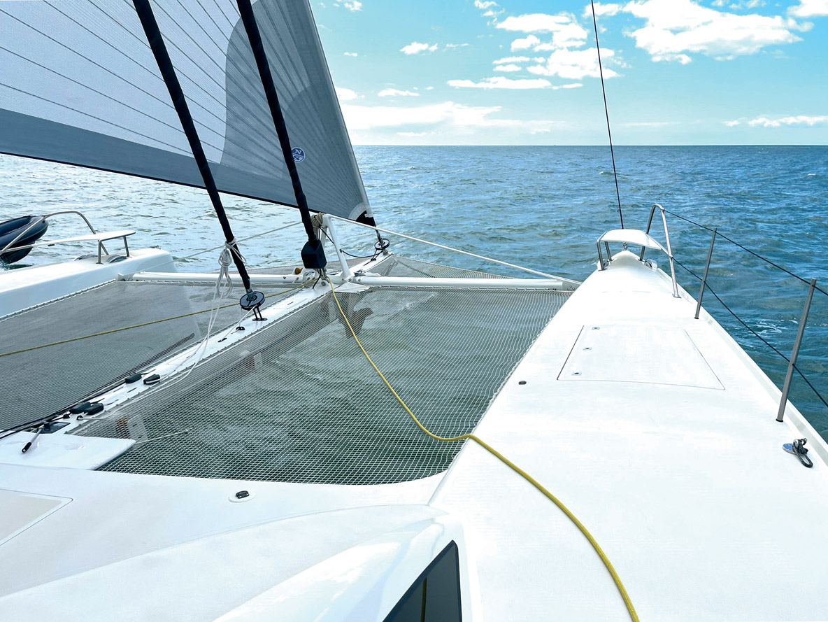 Le mât Axxon en carbone haut module à un étage de barres de flèches semble d’une robustesse rassurante. Les arcs de galhaubans sont très reculés, offrant beaucoup de pied pour une sécurité maximale. La poutre de compression accueille l’amure de trinquette (réglage de tension hydraulique) et le stockeur de gennaker prévu pour rester à poste dans les plages d’utilisation. Le solent est frappé sur la liaison avec la poutre avant, laquelle est une pièce d’orfèvre avec cathédrale et martingale carbone. Cet étagement des surfaces, leur disponibilité et la qualité « course » des implantations d’accastillage constituent la clé de voute de l’utilisation de ce grand catamaran.