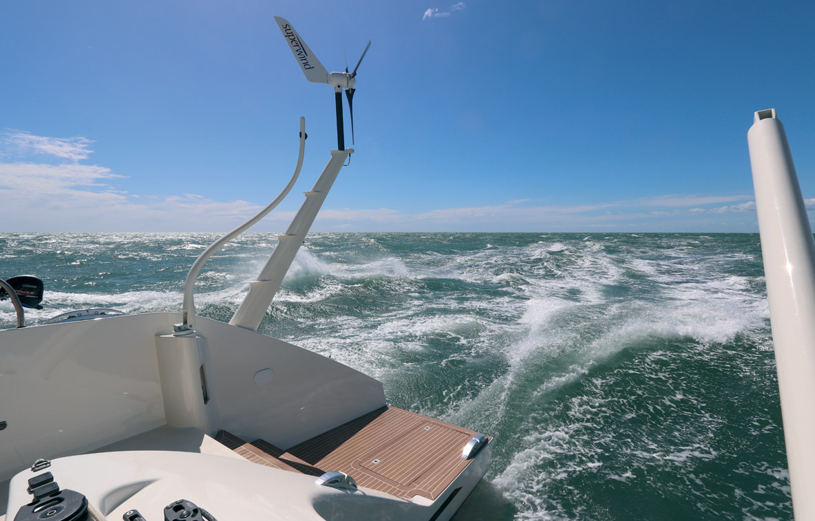 Si l’on considère comme un objectif essentiel du voyage à la voile de pouvoir lâcher prise et de dispenser de toute contrainte – comme une escale technique –, l’autonomie électrique, l’appro- visionnement en eau et la fiabilité des équipements en sont les clés. Le système Integrel est au cœur du dispositif avec deux géné-ratrices (gros alternateurs high tech) accouplées aux moteurs et alimentant un parc de batteries lithium 24/48 V et un convertisseur 48/230 V. La disponibilité de ce système révolutionnaire procure 2 x 4,5 kW au ralenti et jusqu’à 9 kW par moteur à 8 nœuds si on le souhaite en évitant le poids, l’encombrement et les nuisances d’un groupe électrogène. Les deux éoliennes assurent 80 % de la dépense ordinaire, les panneaux solaires (3 kWc) complètent si besoin. Les réservoirs d’eau (1 100 l, on les laissera vides après fiabilisation du dessalinisateur) et de fuel (2 000 l, nul besoin de remplir, il s’agit d’une capacité maximum) sont structurels, centrés et compartimentés dans les fonds. Quant à l’isolation phonique, elle est très soignée. Enfin, la prévention des odeurs et la ventilation ont été élevées au rang de priorités. L’électronique (positionnement, radar, communication, météo) est complète. Le chauffage Webasto et l’air conditionné Frigomar sont là pour réguler les ardeurs des climats traversés.