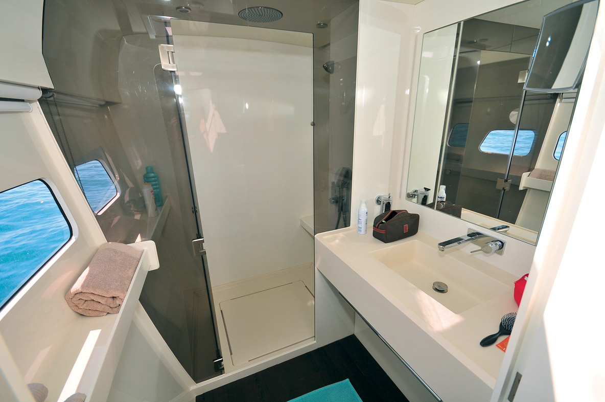 La locution latine « rien qui soit exagéré » résume parfaitement le style intérieur du catamaran. Les volumes sont évidemment présents, mais c’est surtout la pureté des lignes et la qualité perçue qui alimentent la première impression. Tous les éléments d’aménagement sont en sandwich carbone, issus de moules. Le traitement stylique est résolument moderne sans être froid ou ennuyeux.