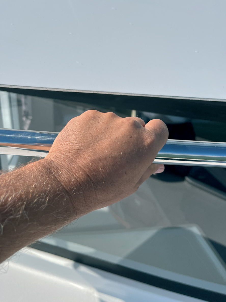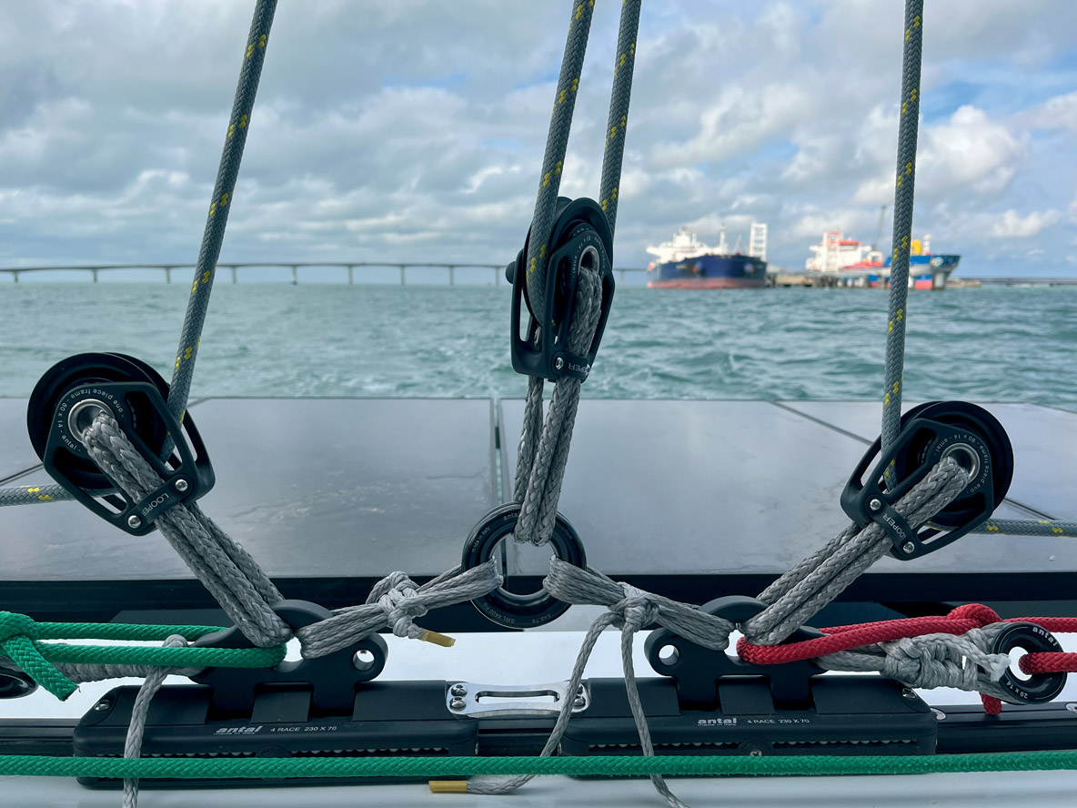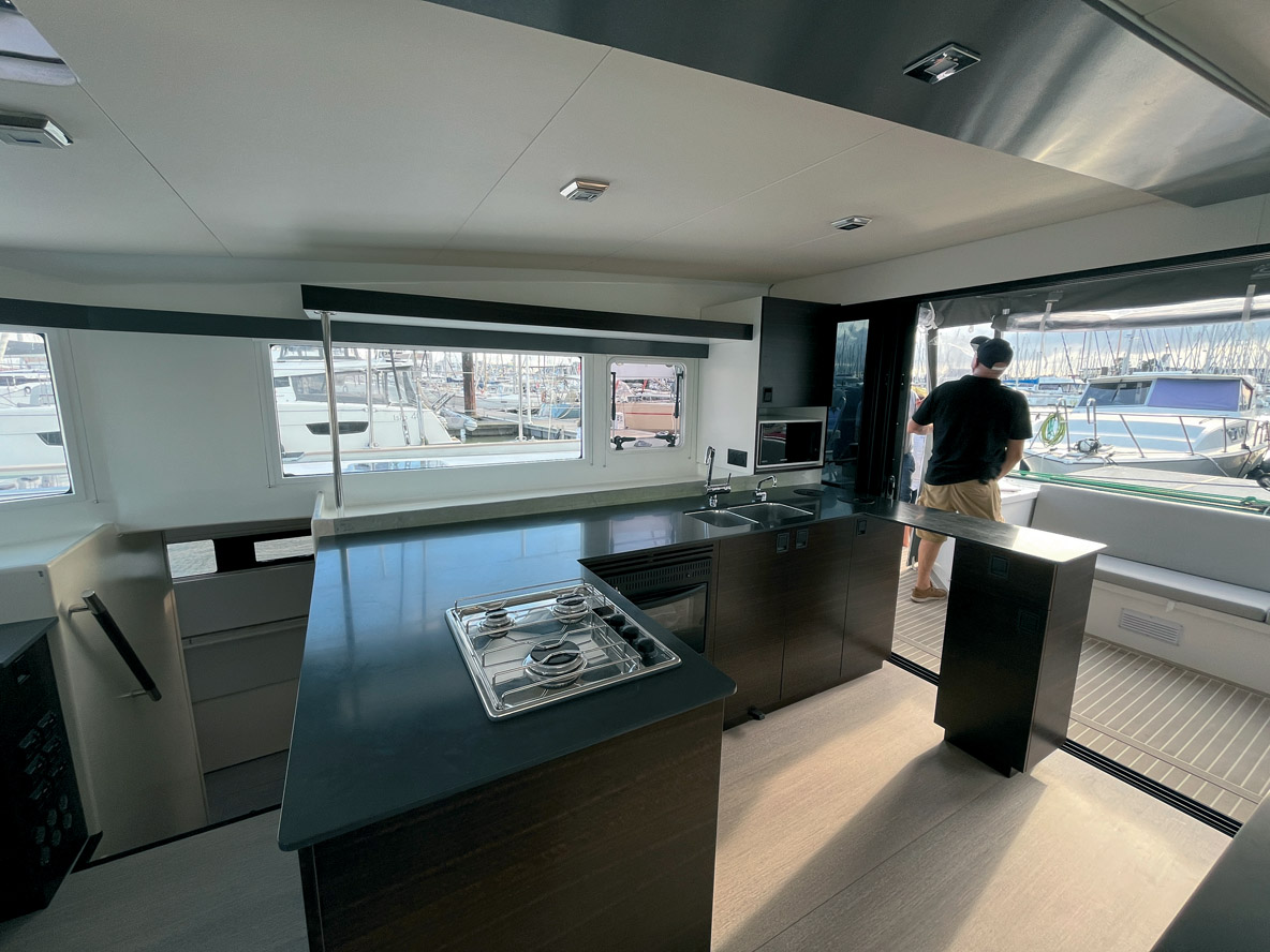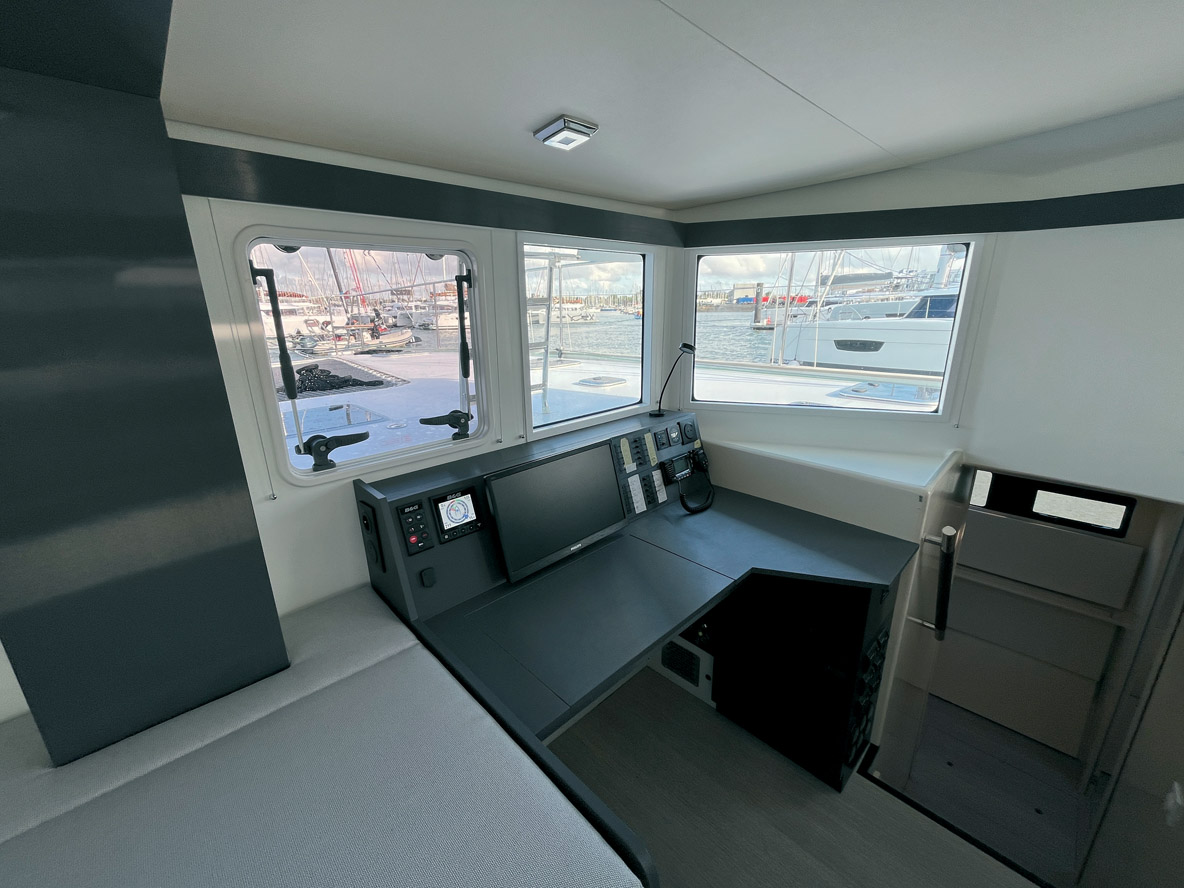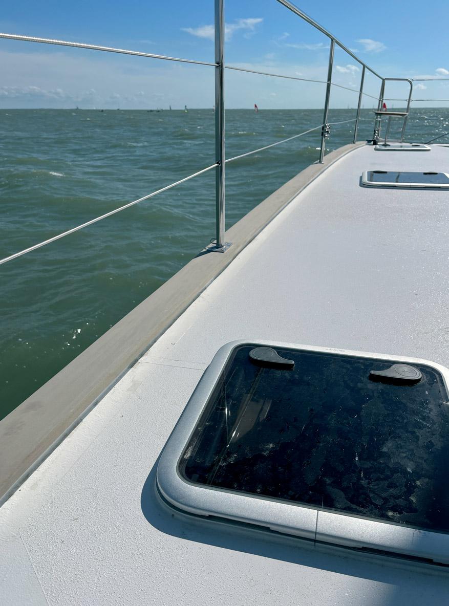 On dispose de deux postes de barre – un à l’arrière de chaque coque – et les manœuvres sont presque toutes ramenées vers le cockpit via d’astucieux renvois d’angle. L’équipage s’affaire à hisser la grand-voile ; en l’absence de flybridge, elle présente une surface maximum avec un bôme rabaissée. Ecoute et rail sont réglés depuis la poutre arrière. A l’avant, on trouve un génois à recouvrement et une trinquette ; tout deux sont à poste et montés sur enrouleur. On relève que la circulation est excellente sur le pont grâce à des larges passavants de 1,31 m et de hauts cale-pieds. Bravo également aux super mains courantes tubulaires en inox qui bordent l’angle supérieur du rouf. Le tableau serait parfait si les hauts chandeliers de 90 cm étaient plus rigides, les panneaux de pont étaient flush et l’échelle mobile qui permet de grimper sur le rouf repensée (ou a minima rallongée) afin d’offrir plus d’angle et des marches bien perpendiculaires.