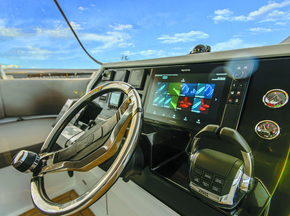 Le hard-top en polyester supporte les équipements de communication, et sur l’avant les tauds transparents en Cristal peuvent être fermés pour protéger des intempéries. La console de direction est dominée par l’écran du traceur de carte Raymarine Hybrid Touch, on y trouve aussi les commandes du pilote automatique et les commandes électroniques des moteurs Volvo D6-435. Parmi les caractéristiques du catamaran, citons leurs deux moteurs éloignés l'un de l'autre (contrairement à un monocoque), ce qui leur confère une très bonne maniabilité, en leur permettant notamment de pivoter sur place ; cette possibilité évite l’installation d’un propulseur d'étrave. Cependant, leur structure imposante intensifie le fardage (et entraîne une consommation accrue de carburant) : des moteurs aussi puissants que ces 435 conviennent donc bien à cette taille de navire.