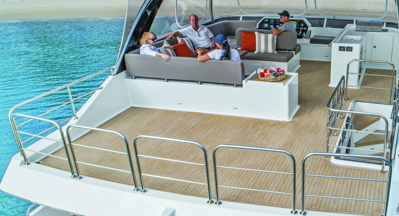 Sur le pont principal, la partie arrière constituera un solide argument de vente pour les acheteurs potentiels, notamment ceux qui viennent du monocoque, toujours plus étroit. L’Iliad 50 dispose d’un vaste espace de détente, typique du catamaran. Le mini-bar et les assises pouvant accueillir jusqu’à 8 convives transforment le pont arrière en une véritable extension du carré, et ce d'autant plus que la cuisine se trouve juste à l'intérieur.