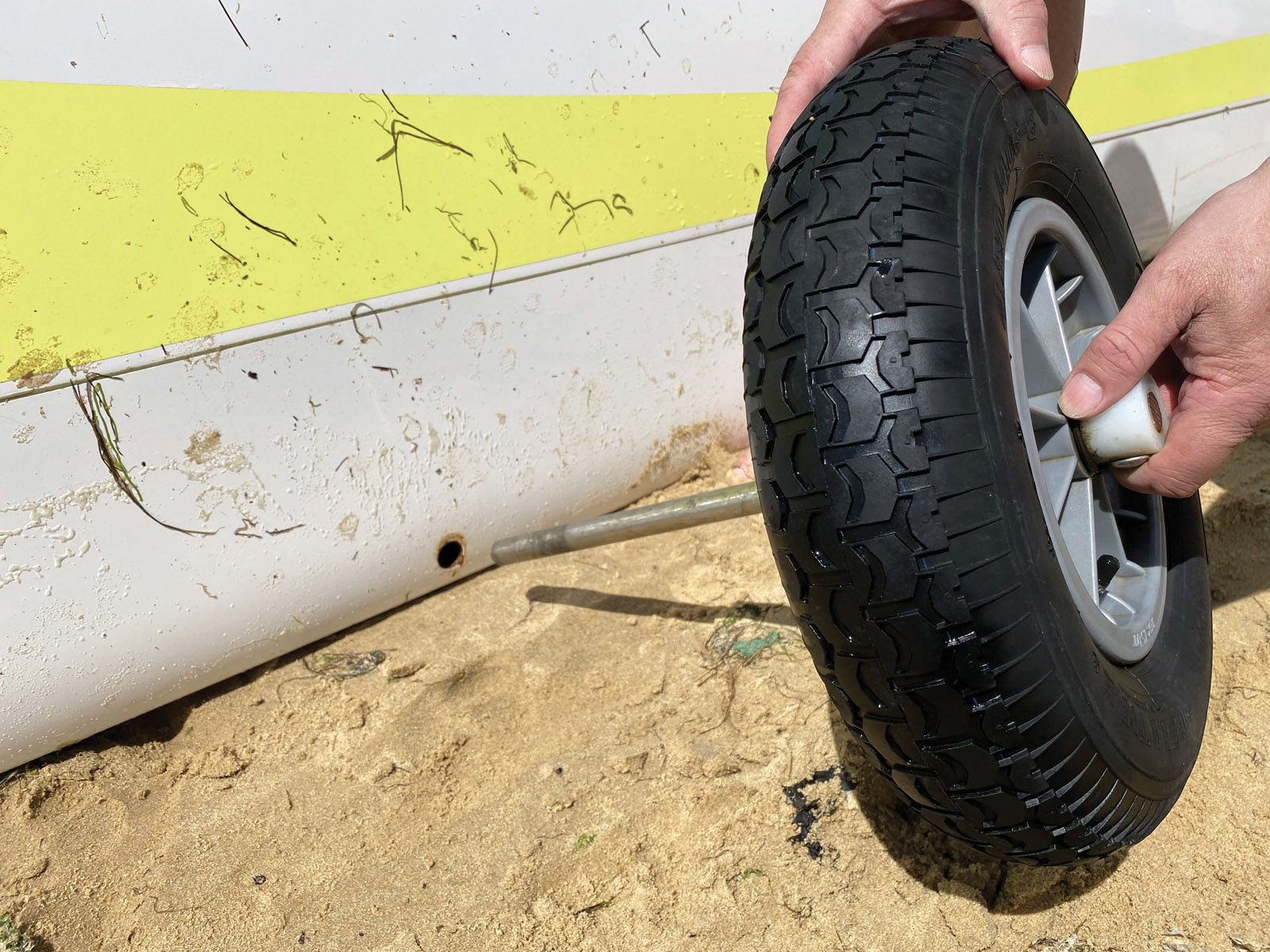 Les roues de mise à l’eau s’encastrent directement dans les coques ; on peut les emporter en navigation.