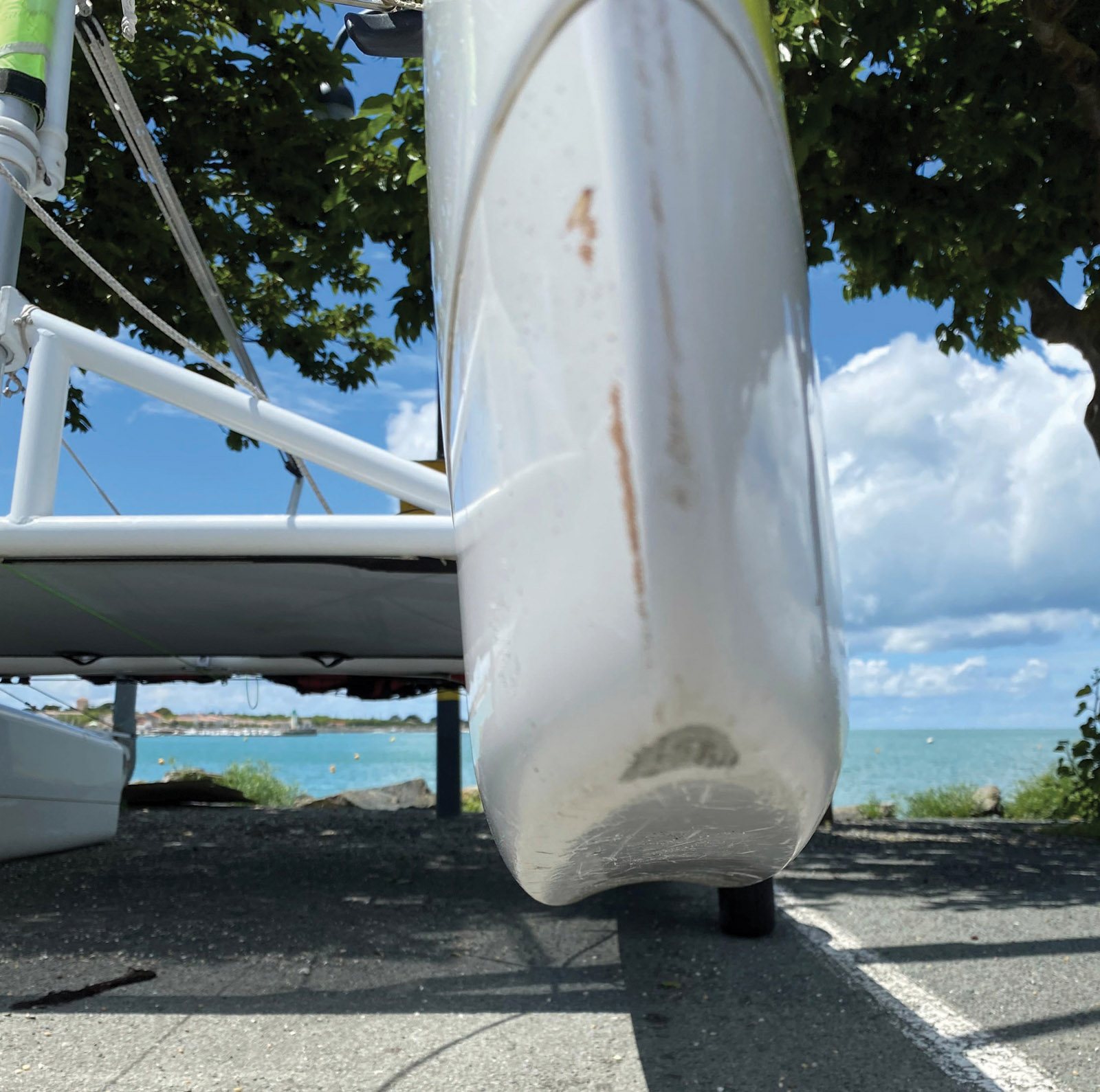 Rendez-vous est pris sur un petit parking ombragé par des pins : quelques voitures, bien sûr, mais surtout un drôle de catamaran prêt à naviguer. François Tissier, à l’origine du projet, est en pleine discussion avec une famille franco-belge : Nino, en fauteuil roulant, semble très désireux de naviguer ! Cette rencontre impromptue démontre que l’Iziboat – avant même de naviguer – mérite bien son nom. L’intérêt de ce petit multicoque est bien sûr la possibilité de le démonter – et donc de le transporter et le stocker – très facilement. L’opération prend 15 minutes. La bonne tenue des différents éléments est assurée par deux puissantes sangles. Pour ceux qui habitent près de l’eau, le constructeur suggère même le transport en vélo. Possible en effet, mais sur un terrain plat, puisque l’Iziboat pèse tout de même 152 kg – soit autant qu’un Hobie 16. Quelques kilos devraient être gagnés sur les prochains modèles de série. Première astuce pour la mise à l’eau : des roues s’encastrent directement dans les flotteurs. Les coques en polyester adoptent un dessin moderne avec des étraves inversées et un volume généreux – 469 l par flotteur.
