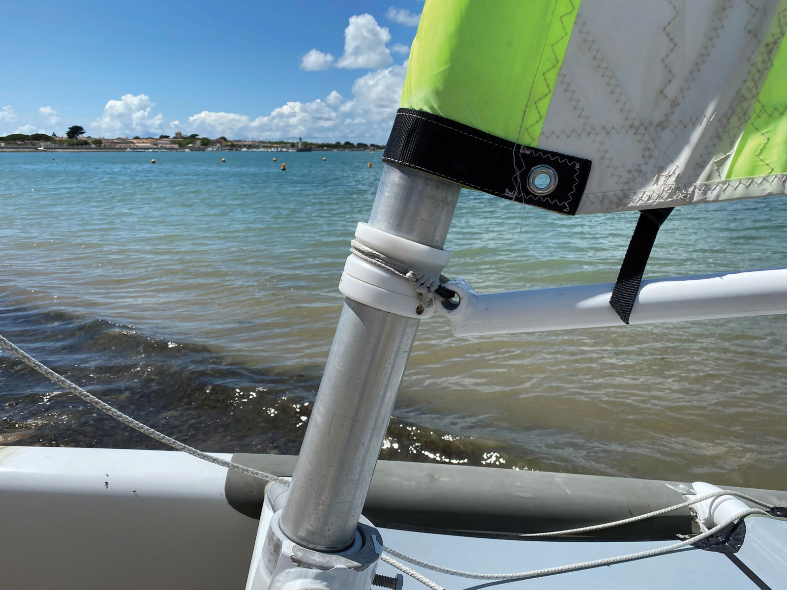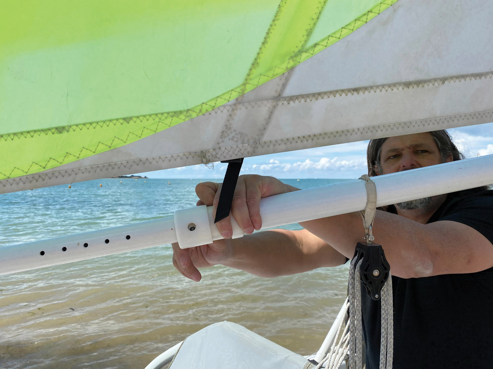 Vit-de-mulet coulissant sur le mât et articulé afin de pouvoir mâter la bôme, réglage de la tension de bordure grâce un cliquet : le gréement fourmille d’astuces !