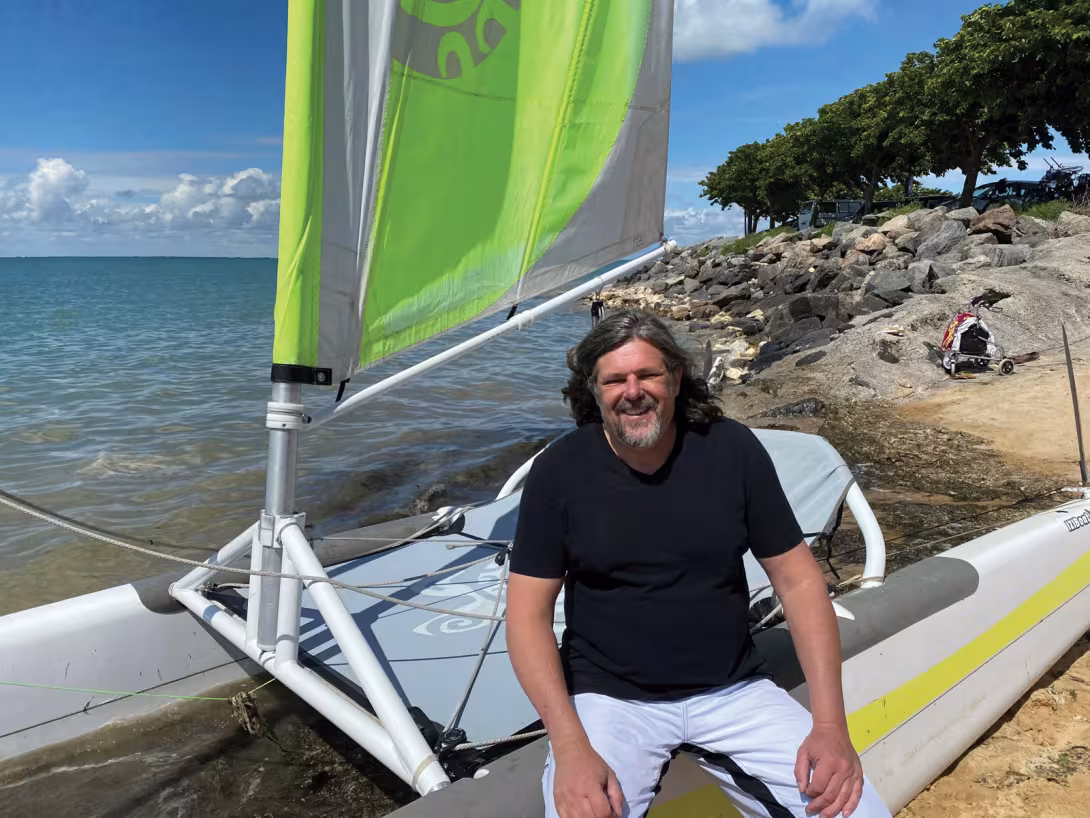 « Voilà bientôt dix ans que je me déplace en chaise roulante. Cela faisait aussi au moins autant de temps que je n’avais plus navigué ! Cet après-midi, j’ai rencontré François par hasard, il montait son prototype Iziboat et on a échangé quelques mots. Il n’en a pas fallu plus pour qu’il me propose un essai en mer ! Je ne m’y attendais pas : une vraie bonne surprise. Le transfert à bord s’est effectué sans problème. Malgré le fait que je n’aie plus l’usage de mes jambes, j’ai pu m’installer tout seul facilement. Un vrai bateau inclusif. Super impressions en mer. L’assise permet une très bonne stabilité et laisse suffisamment d’aisance pour naviguer en autonomie. Une superbe expérience pour un retour en mer réussi ! »