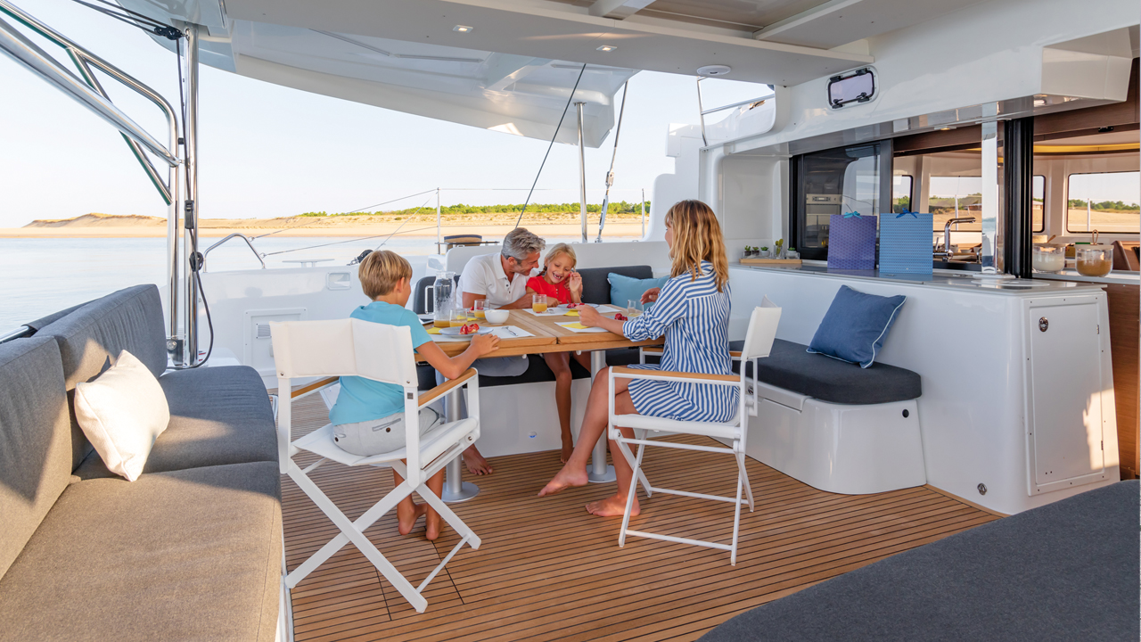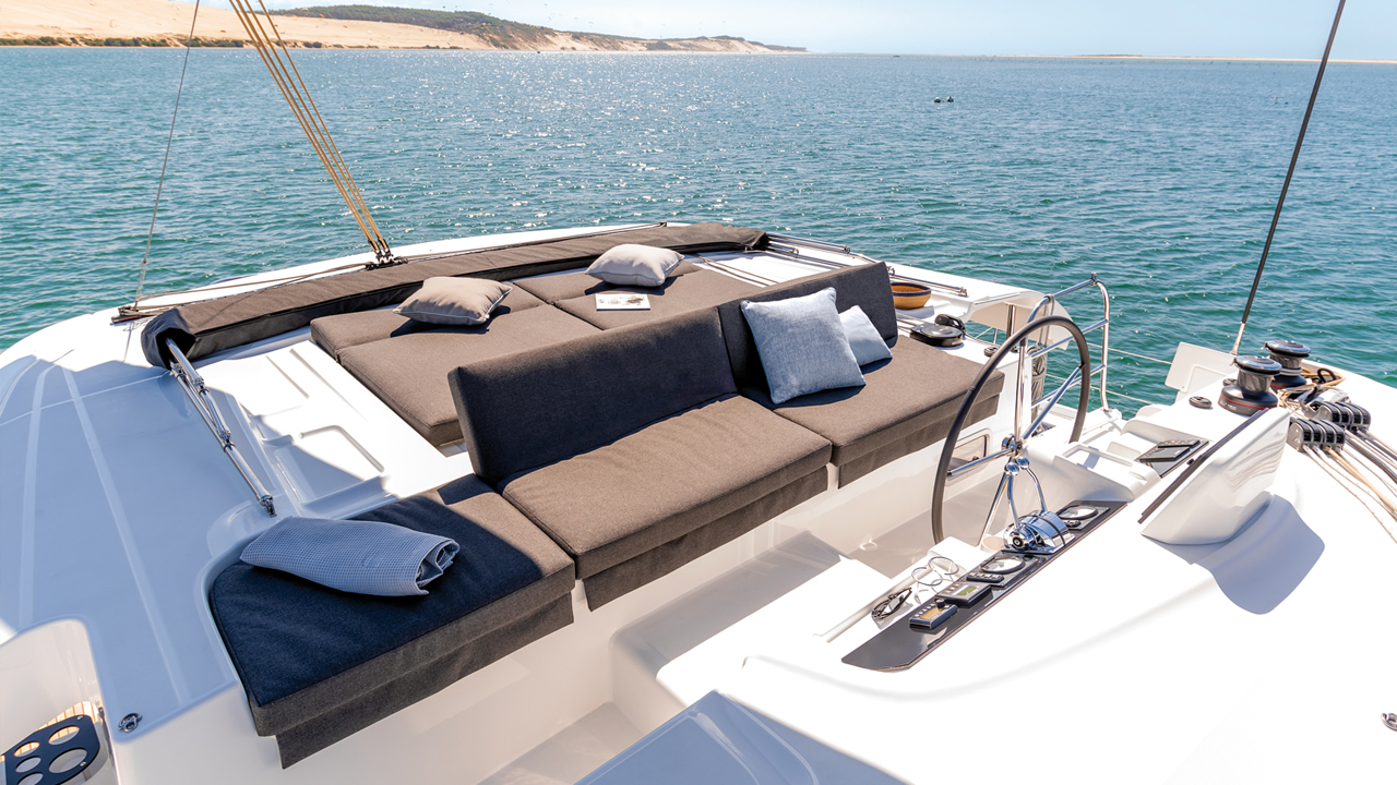 Un gros travail a été fait sur l’acceptabilité esthétique, et cela a été payant : la perception du bateau est plus flatteuse qu’avec les formes antérieures, le toit du roof, comme légèrement décroché de la structure, est plus aérien ; les montants de roof noyés dans la continuité des panneaux plexi rendent le pare-brise plus fluide. Le flybridge, plus discret que sur le 440/450, et le bimini aisément rabattable favorisent une utilisation rationnelle de ces équipements et une meilleure observation du plan de voilure. La sculpture des panneaux de bordés, l’insertion de 3 grands puits de lumière latéraux dans une réservation, la délicate nervure du redan extérieur permettent à l’œil de mieux appréhender la forme générale et l’attitude de ce catamaran dont le plan de voilure s’élance à près de 25 m, (il porte 197 m2 de toile par petit temps !). Le nouveau design des jupes améliore l’accès à bord, et participe également à ce renouveau formel.