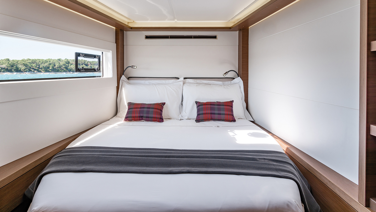Le choix de parements Alpi noyer tranche habilement avec les modèles chêne clair qui s’étaient généralisés jusqu’à saturation. Effet de surprise ou réalité ? Je trouve l’ambiance générale plus cosy et reposante pour les yeux ! La lumière (bandeaux de leds indirects) est superbe et procure un effet tamisé très apprécié. Dans la cabine propriétaire, le design des meubles a été complètement renouvelé (bureau, bibliothèque, sofa) et laisse penser qu’un décorateur bienveillant s’est occupé personnellement de votre bateau. L’implantation à l’avant de vrais Island beds de 1,60 m de large avec accès latéraux désamorcera tous les conflits potentiels d’attribution de cabine au sein de l’équipage : chacun jouit des mêmes prestations et profite de salles d’eau et de toilettes privatives. En version propriétaire, la salle de bains XXL et les toilettes séparées (WC électriques) sont dignes d’un petit yacht !