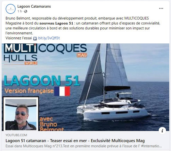 Promettant d’être plus écologique, plus accessible et plus connecté, le Lagoon 51 annoncé par surprise ou presque en début d’année fait le plein de promesses. Les portes de l’International Multihull Show sont à peine refermées que les pontons s’ouvrent, libérant le nouveau catamaran pour une bonne journée de convoyage de la Grande-Motte à Canet-en-Roussillon – et un essai en exclusivité sous le commandement de Bruno Belmont, le Monsieur Lagoon !