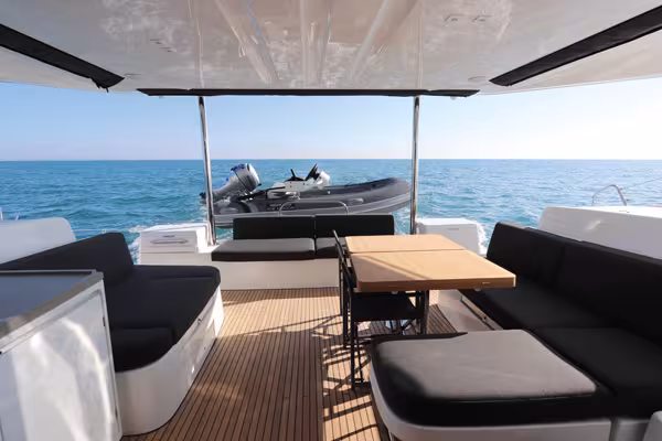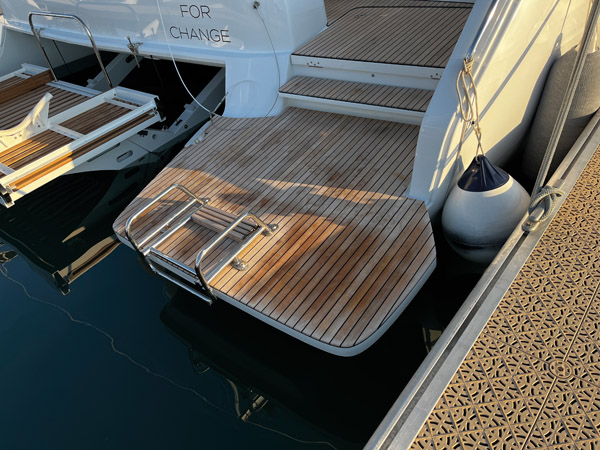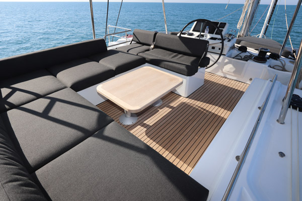 Cette image du Lagoon 51 montre bien l’utilité du nouveau dessin des jupes arrière – reste que ces dernières devront être bien protégées lors de certaines manoeuvres de port avec appui sur les angles arrière.