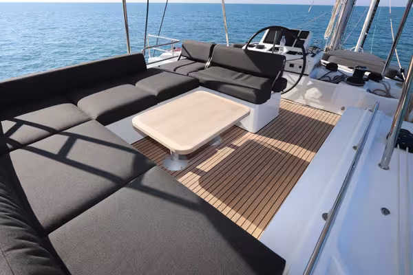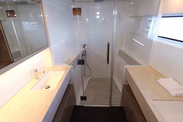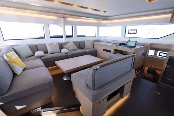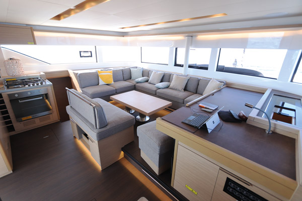 Mais ce ne sont là que des détails au regard de l’attention particulière qui a été portée à l’accès à bord et à la circulation. Cela commence dès les jupes, avec un accès à bord facilité par leur forme et leur positionnement, qui les rapprochent du ponton. Leur surface est aussi plus accueillante, et on ne se bousculera plus à la descente de l’annexe – trois personnes y tiennent debout simultanément et sans se gêner. A seulement deux marches au-dessus, le cockpit mais aussi toute la nacelle de plain-pied sont immédiatement accessibles. Deux évolutions ont permis cette linéarité : des jupes un peu plus hautes sur l’eau et une épaisseur réduite au minimum entre fond de nacelle et plancher de cockpit. De quoi profiter pleinement de ce dernier, dont la vaste surface est divisée en trois zones. Une plancha orientable précède la banquette arrière, une méridienne occupe le côté tribord et une banquette en L entoure la table à bâbord. Une partie de l’assise peut d’ailleurs s’avancer pour agrandir la tablée au mouillage, mais cela entrave l’accès direct au flybridge. A l’intérieur, une fois la baie vitrée refermée et le bruit des moteurs atténué, tout n’est que luxe et volupté. Une différence de taille par rapport au 50 (voir essai comparatif Lagoon 50 vs Excess 15 dans notre HS14) : l’encombrante épontille toute proche de l’entrée a logiquement disparu. On note également la coque Propriétaire, encore plus luxueuse avec son dressing aménagé en standard. Quant à la coque bâbord, elle offre trois couchettes en version de base. Le mobilier signé Nauta Design est toujours aussi chaleureux, et les matériaux cossus. On apprécie le grand hublot ouvrant en avant du pied de mât, il sera une source de ventilation naturelle importante au mouillage.