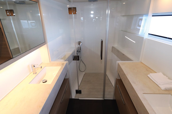 Dans la salle d’eau tribord – très bien finie –, les vasques en vis-à-vis évitent l’effet couloir.