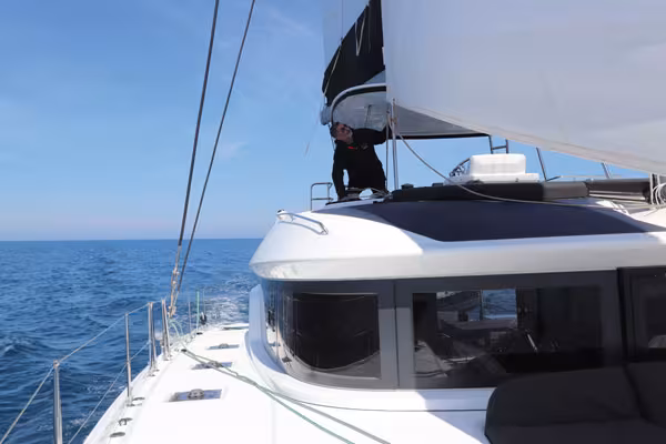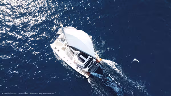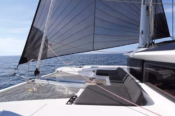 Le vent revient enfin à l’approche des Pyrénées, il est temps de hisser les voiles. Un petit tour sur le bimini afin d’aider les lattes à passer les lazy-jacks confirme qu’il faudra trouver une solution moins périlleuse. Peut-être en dédoublant les longues sangles prévues pour refermer le lazybag ? Elles pourraient alors servir à l’écarter. Occupé à prendre des photos et à faire voler le drone, je laisse Bruno effectuer toutes les autres manoeuvres en solitaire. Cela semble être un jeu d’enfant : drisses et écoutes reviennent toutes au poste de barre central avec les winches électriques optionnels. De là-haut, on profite d’une parfaite vue sur le plan de voilure. Sous Code 0, la vitesse oscille entre 7,8 et 8 noeuds, soit la vitesse du vent réel – nous pointons il est vrai à 60 degrés de l’apparent. Mais, même sous génois, nous sommes agréablement surpris de dépasser les 7 noeuds à 55 degrés du vent. La nouvelle répartition du plan de voilure et le retour à un mât plus avancé n’y sont certainement pas étrangers. En impliquant là encore ses fournisseurs, et en allant même chercher la compétence d’un cabinet de calcul externe, Lagoon est parvenu à améliorer le mât : le profil n’a plus de losanges agressifs pour les génois, mais deux étages de barres de flèches poussantes. Tout en étant plus léger, le profil divise mieux les panneaux, et offre ainsi plus de possibilités de réglages. La voilure, quant à elle, a été confiée à la voilerie Elvstrøm. Au-delà de leur savoir-faire de maître-voilier qui n’est plus à démontrer, proposer des voiles issues de matériaux recyclés a semblé très pertinent à l’équipe de conception du nouveau Lagoon.