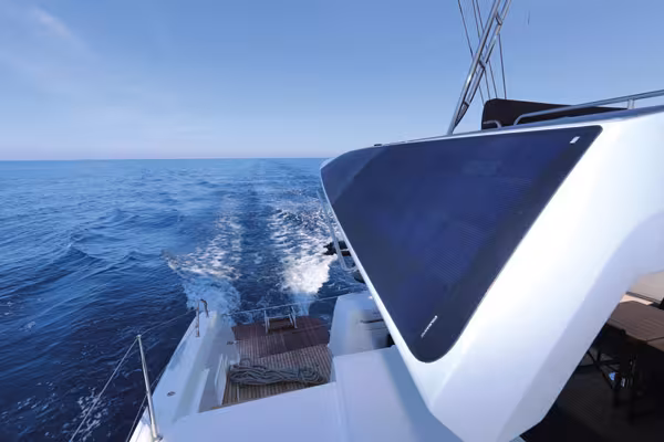 Un peu plus 3 000 Wc de panneaux solaires dernière génération ont été collés sur le rouf.