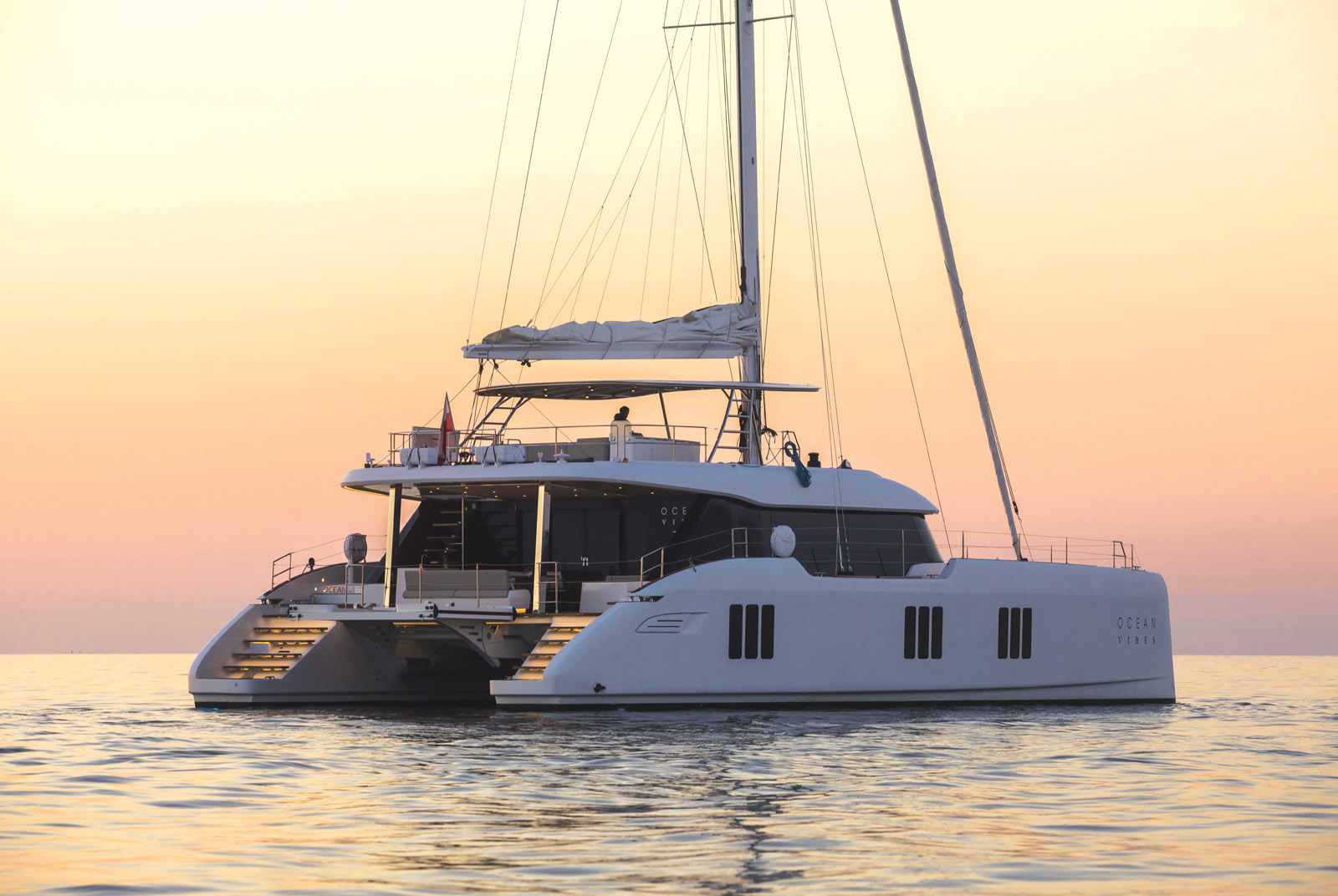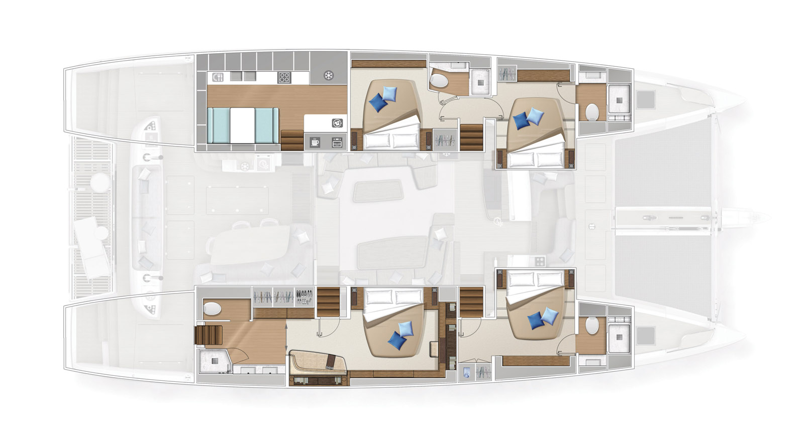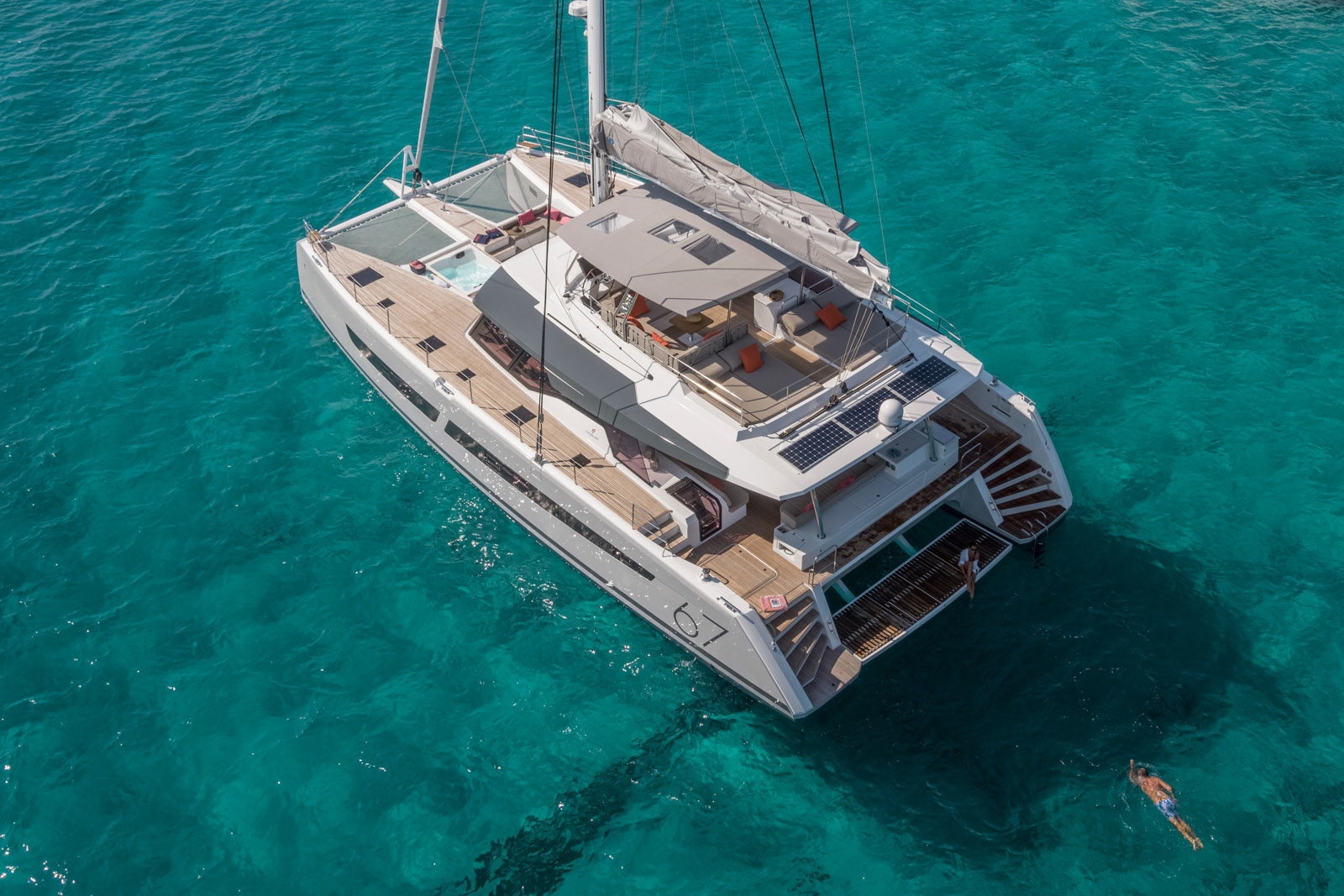 Les designers ont privilégié les grandes surfaces planes – on compte pas moins de 90 m2. Ces grands dégagements facilitent les déplacements à bord et renforcent cette impression de très grand multicoque. Le cockpit arrière est parfaitement agencé sur 36 m2 avec une cuisine extérieure sur bâbord, une grande table et ses assises. Il est totalement couvert et donc protégé du vent, des intempéries et du soleil. A l’arrière, la grande banquette est réversible ; on peut s’y installer face à la marche, ou admirer le sillage… Les deux jupes arrière sont larges, et la plate-forme hydraulique centrale facilite la mise à l’eau du semi-rigide (jusqu’à 4,6 m de longueur). Les passavants sont évidemment très larges, de vrais boulevards… et ils sont protégés par un pavois épais et un jeu de balcons, chandeliers et filières rigides à souhait. A l’avant, un second cockpit de 13 m2 bien protégé du vent sera prisé par les amateurs(trices) de bains de soleil. Plus près des étraves encore, une batterie de coffres profonds et deux trampolines.