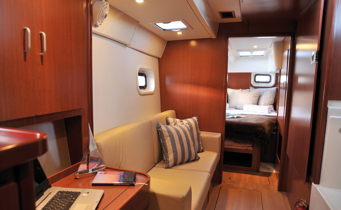 La nacelle assure une très convaincante circulation en diagonale, d’une porte à l’autre. Et en pratique, on rejoint très volontiers le cockpit avant et le trampoline en passant par l’intérieur sans emprunter les passavants. Une aisance inhabituelle qui fait tout l’attrait de ce modèle ! Avec 2,12 m de hauteur sous barrot, vous ne vous sentirez pas à l’étroit, d’autant que la lumière est généreuse et l’aération soignée. La table du carré, avec ses 82 cm x 163 cm, peut accueillir 7 ou 8 personnes. Elle fait également office de table à cartes. Grâce à son accès direct au cockpit, la cuisine avec ses deux éviers est très conviviale. Préparer des bons petits plats n’est vraiement pas une punition. De l’autre côté de l’entrée, le chantier a installé le frigo et le tableau électrique, très complet. Les cabines sont logiquement aménagées dans les coques – trois ou quatre suivant la version retenue et autant de cabinets de toilette. Larges d’1,60 m à la tête, les couchettes accueilleront les couples encore plus confortablement qu’à la maison. On apprécie les nombreux rangements disponibles. Et la finition, propre et de bon goût, à même de supporter un usage intensif.