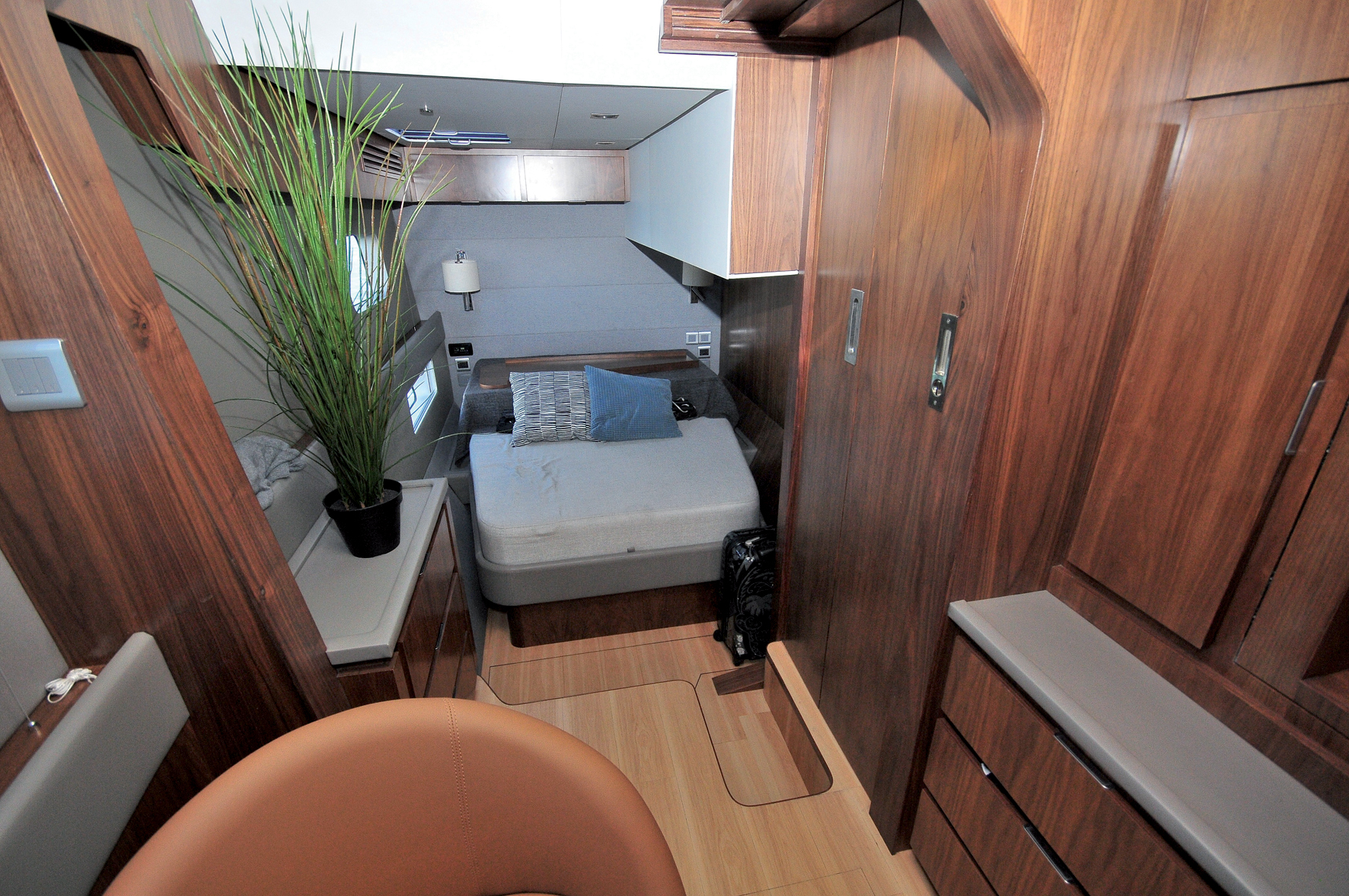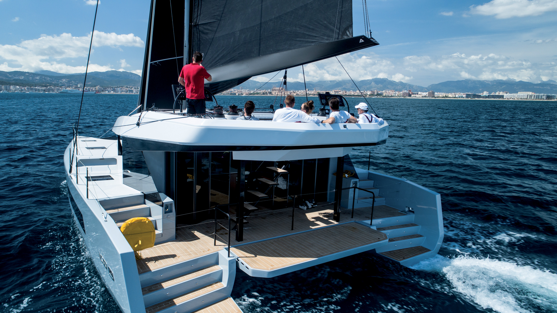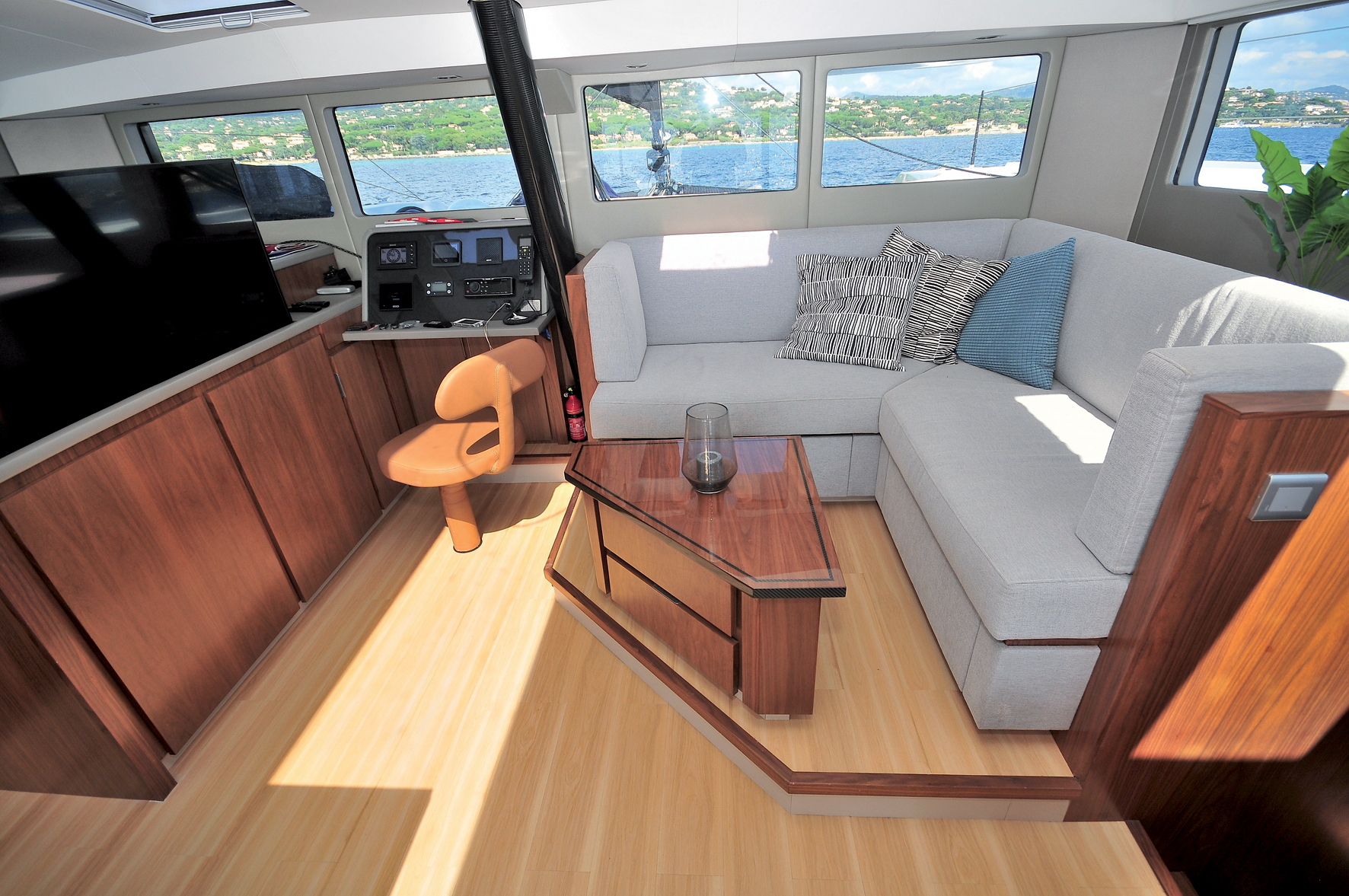 Cet étonnant catamaran est disponible en version 3 cabines propriétaire, 4 cabines ou même day charter, et l’acquéreur peut choisir entre 3 ambiances stylistiques différentes : Sweden, Bermuda et Hong Kong (Sweden pour notre bateau d’essai). Ces 3 offres constituent une bonne alternative au semi-custom qui génère surcoûts et temps supplémentaire de bureau d’études ; ici, le futur propriétaire peut composer avec 3 finitions différentes, une (presque) personnalisation sans les aléas ! La déclinaison Sweden fait appel à des parements bois type merisier aux tons chauds, des sols chêne clair et une belle sellerie grège. Dans la cabine master, de très jolis sièges "œufs sixties" en cuir habilement revisités ont trouvé place, les différences de niveau contribuent à une perception de l’espace originale (mais attention à la marche !), le travail d’ébénisterie est remarquable, les grands hublots permettent au regard de traverser la muraille. La salle d’eau est magnifique (mais la vasque est trop petite !) ; une belle atmosphère, presque une griffe ! La cuisine équipée permet de travailler en semi outdoor protégé dès que les baies coulissantes latérales sont ouvertes ; elle fait face à un îlot central-bar couvert de Corian autour duquel 10 personnes prennent place confortablement. Le canapé banquette est spacieux, le ciel de toit superbe est percé de puits de lumière occultants et de spots leds du plus bel effet. La lumière naturelle est splendide, et ce bel espace lounge semble comme par magie exister dedans ou dehors selon les réglages des panneaux coulissants latéraux et arrière. Le cockpit est une terrasse, de plain-pied avec la plate-forme hydraulique, support de plongée-baignade ; l’accès à la "passerelle" s’effectue par un escalier protégé, sécurisé par des mains courantes carbone bienvenues. En bas, la convivialité, au-dessus, la navigation ! Les invités qui le souhaitent peuvent également s’installer confortablement dans la banquette de navigation sans gêner ou être gênés par l’équipage en action.
