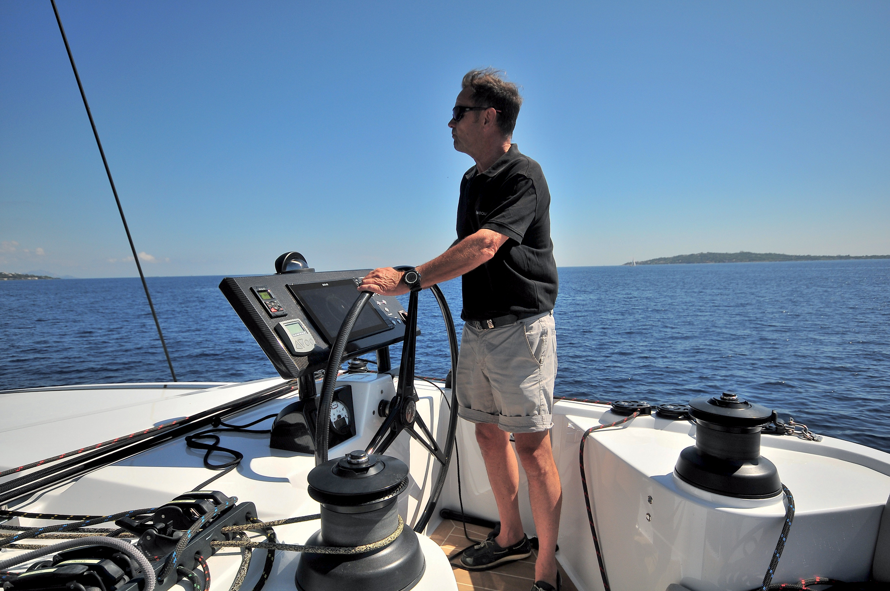 6 : Le poste de barre, juché en hauteur et très reculé dans le bateau, offre une vision exceptionnelle sur la trajectoire et le plan de voilure.