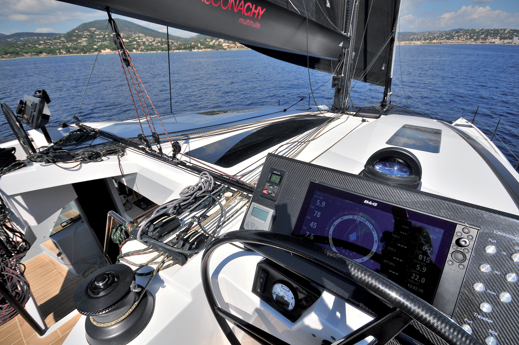 Naviguer à bord du MC50’ constitue une nouvelle expérience ; en premier lieu, celle de la rencontre avec une ergonomie différente, étonnante et finalement séduisante. Le comportement du bateau dans le petit temps surprend agréablement ! C’est un gros bateau pour sa longueur, aussi l’apport du Yacht Controler (de série !) est-il bienvenu en manœuvre portuaire. Cette télécommande permet d’agir depuis la nav-station ou le cockpit sur les inverseurs moteurs et même sur un ou deux propulseurs d’étraves si le bateau en est équipé. Avec un peu d’habitude, il est possible de manœuvrer cet imposant multicoque dans un emplacement réduit ! Avec la motorisation standard, la motricité du MC50 est parfaitement satisfaisante, ces 4 cylindres de 2,2 l à injection directe par rampe commune développent 57 CV pour une consommation de 4 litres à 2200 tr et 10 litres à 2800 tr (régime maxi : 3000 tr/min), il faut compter sur une vitesse de croisière d’environ 7,5 nœuds. La question d’installer les 2 X 80 CV optionnels se pose tout de même quand on sait que cette motorisation ne pèse que 20 kg supplémentaires (235/254) par moteur, et qu’elle autorise les mêmes performances 200 tr/min plus bas (attention tout de même à la consommation à haut régime, 16 l/h par moteur à 3200 tr/mn pour environ 10 nœuds). Contre toute attente, je m’habitue immédiatement à la position de conduite qui, finalement, est plus classique qu’il n’y paraît. Les deux barres à roue (superbes) sont positionnées de part et d’autre d’un généreux plan de pont assisté de 4 très gros winches électriques, et la position "tout à l’arrière" favorise une excellente observation des voiles. La vision périphérique est fantastique ! Nous aurons peu de vent lors de cette journée, mais ces conditions mettront en évidence les excellentes performances du MC50’ dans le petit temps (5-10 nœuds réels de secteur sud). Grâce aux dérives super profondes et fines, le comportement sous gennaker est remarquable ; le plan anti-dérive accroche bien et génère un appui dynamique qui favorise de bonnes performances pour un catamaran aussi volumineux. La barre hydraulique est étonnamment directionnelle, pas de feed back sensible, mais un agrément réel et un bon effet directionnel. Les winches 65’ Harken électriques sont biomécaniquement bien positionnés et permettent des actions précises, puissantes et rapides ; bloqueurs, organiseurs, choix de textiles participent à la lisibilité et à l’efficacité du piano. Une mention spéciale pour la large barre d’écoute assistée par le line driver Harken qui automatise le réglage du chariot de GV en permettant une réactivité remarquable et appréciée. Le déroulement et la réduction du foc autovireur ainsi que du Code 0 sont également assistés depuis la nav-station. La position de barre est idéale par beau temps et favorise l’attention aux réglages de ce plan de voilure superbe, mais qu’en sera-t-il en conditions dégradées ? La banquette arrière est confortable, pour les équipiers comme pour l’équipage. Dans les conditions légères de l’essai, le résultat sur l’eau est très satisfaisant ; une vitesse bateau entre 80 et 95 % de la vitesse du vent réel avec une telle limousine démontre le soin apporté à l’ensemble !