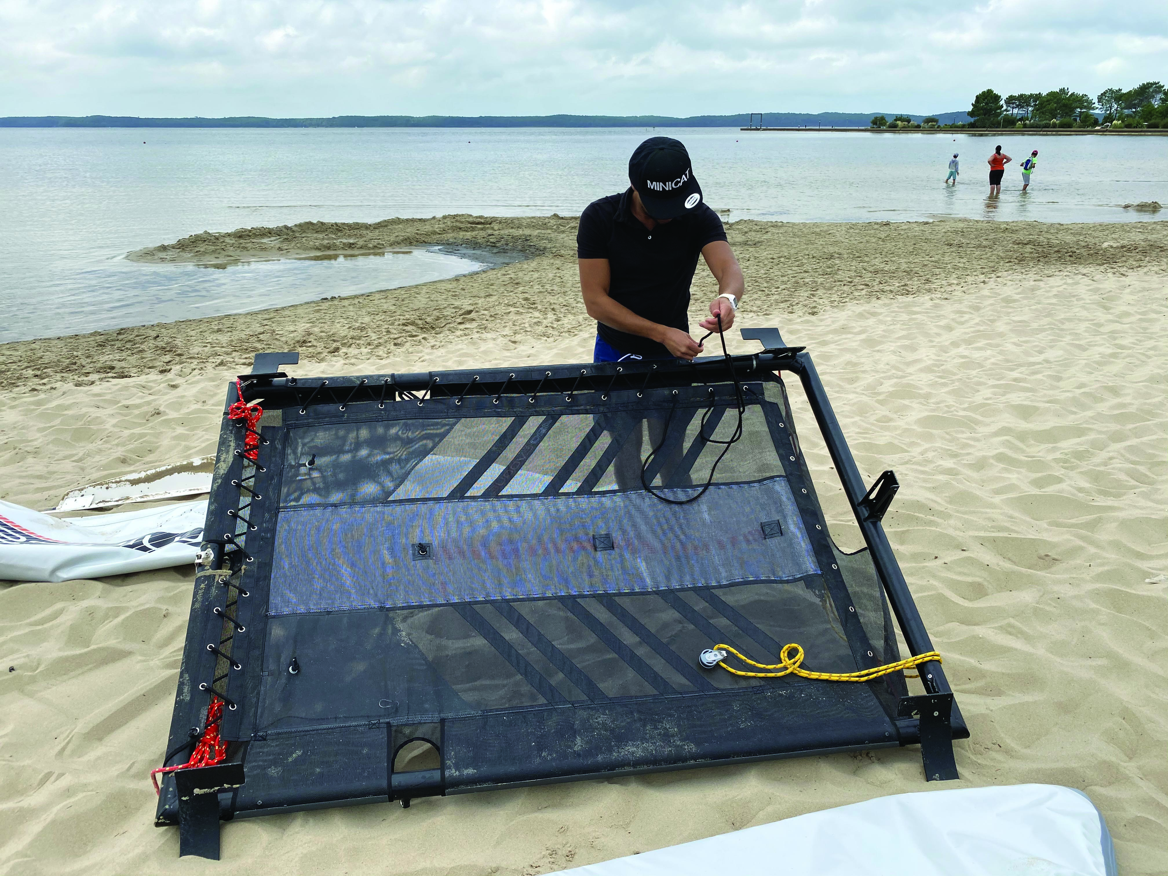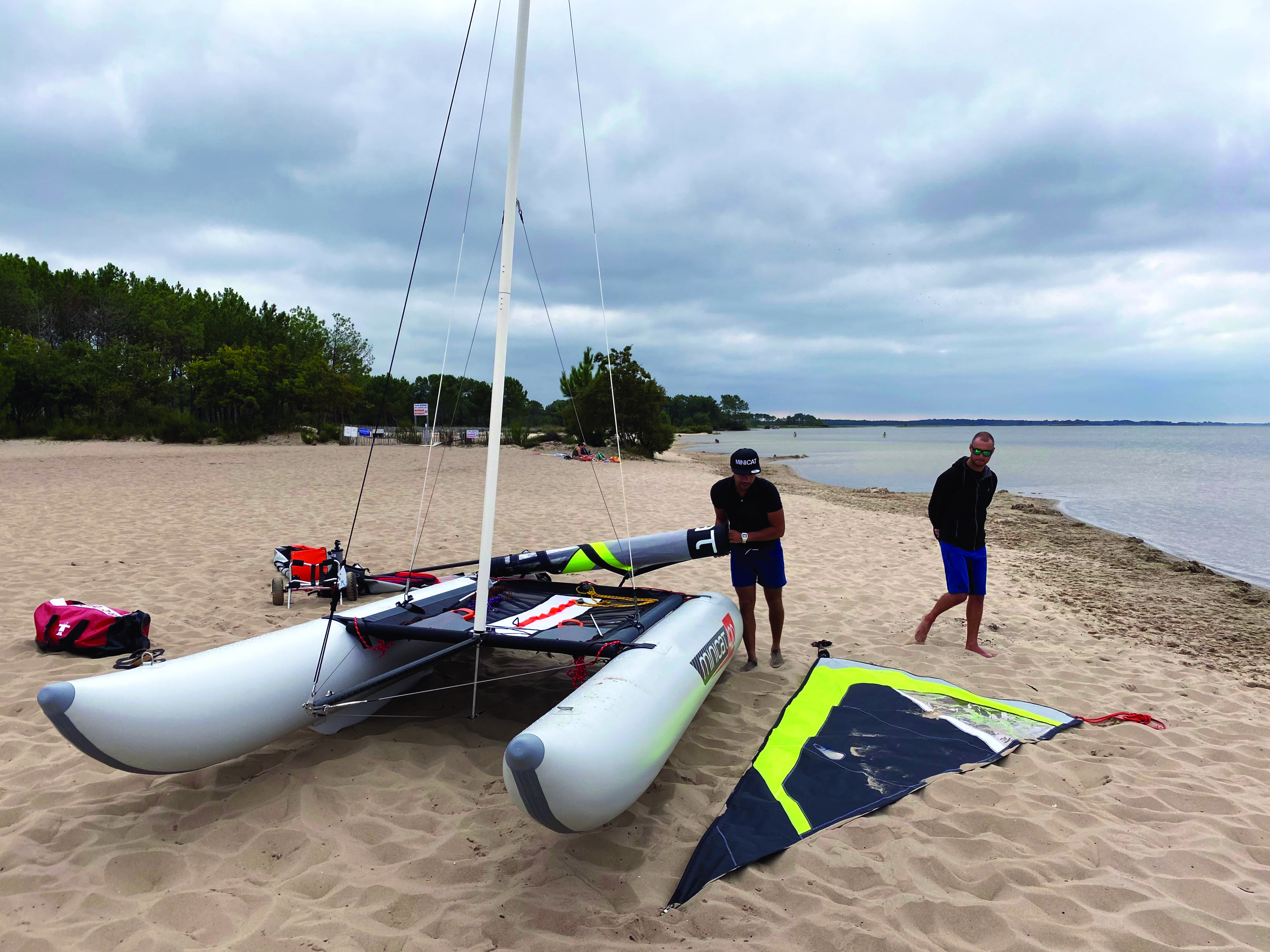 Le MiniCat 420 tient donc dans deux sacs de 175 x 30 x 30 cm – Lieu de l’essai : lac d’Hourtin, France Conditions : eau plate, 8 à 10 nœuds de vent de nord-nord-ouest 80 MiniCat 420 LE BEST-SELLER DES CATAS DE POCHE ! 51 kg tout mouillé : le 420 se porte facilement à deux. On peut le tirer seul sur le sable. ESSAI ils sont prévus pour rentrer dans une voiture standard en repliant seulement un siège. Chaque sac pèse un peu plus de 25 kg. En option, ils sont équipés de roulettes. Un chariot de kayak fonctionne très bien également. Le gabarit de l’engin permet un montage sur le trampoline, mais la mise à l’eau et la sortie d’eau peuvent être acrobatiques…