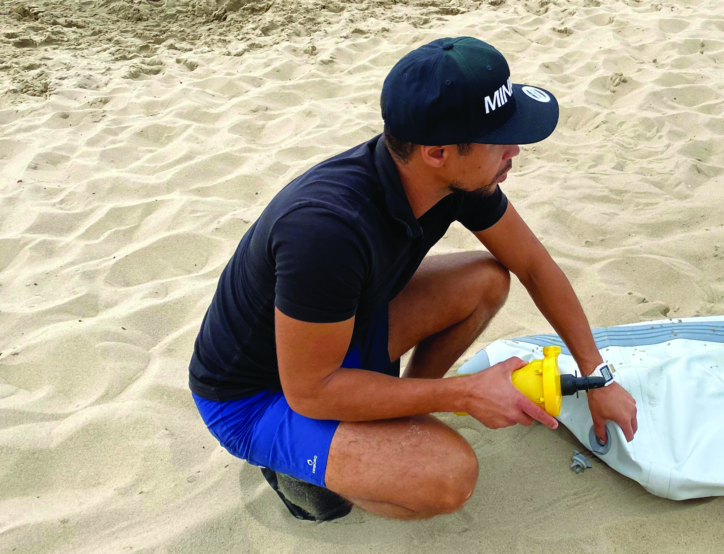 3/ Mise en place de la structure et des dérives sur les boudins dégonflés. - 4/ Gonflage à l’aide d’une pompe électrique et finition à la pompe à main – 0,25 bar.