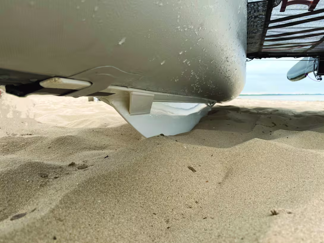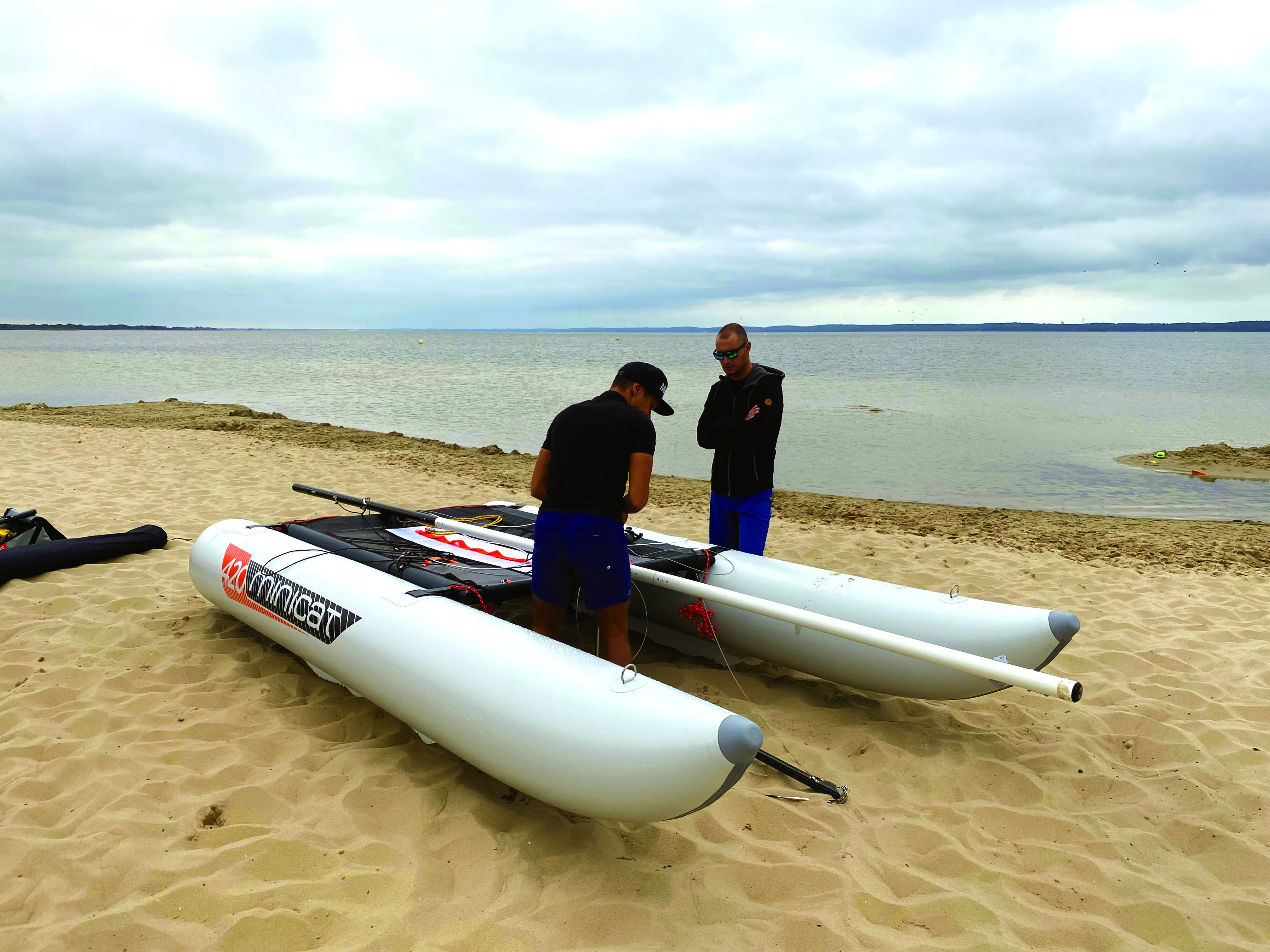 Mise en place des boudins, de la structure alu, du gréement (mât en trois parties), du safran… Toutes les opérations sont ultra simples et ne réclament aucun outillage. Les deux boudins sont gonflés une fois le trampoline et les petits quillons en polypropylène mis en place. Le gonflage peut être assuré par un gonfleur électrique et achevé par le gonfleur manuel pour atteindre 0,25 bar. Le 420 est finalement très proche d’un catamaran léger en dur avec ses quatre poutres en aluminium, son trampoline et son gréement haubané. Seules différences, les appendices : les petits quillons et l’unique safran central. Le montage réclame 45 minutes tout seul, 30 à deux.
