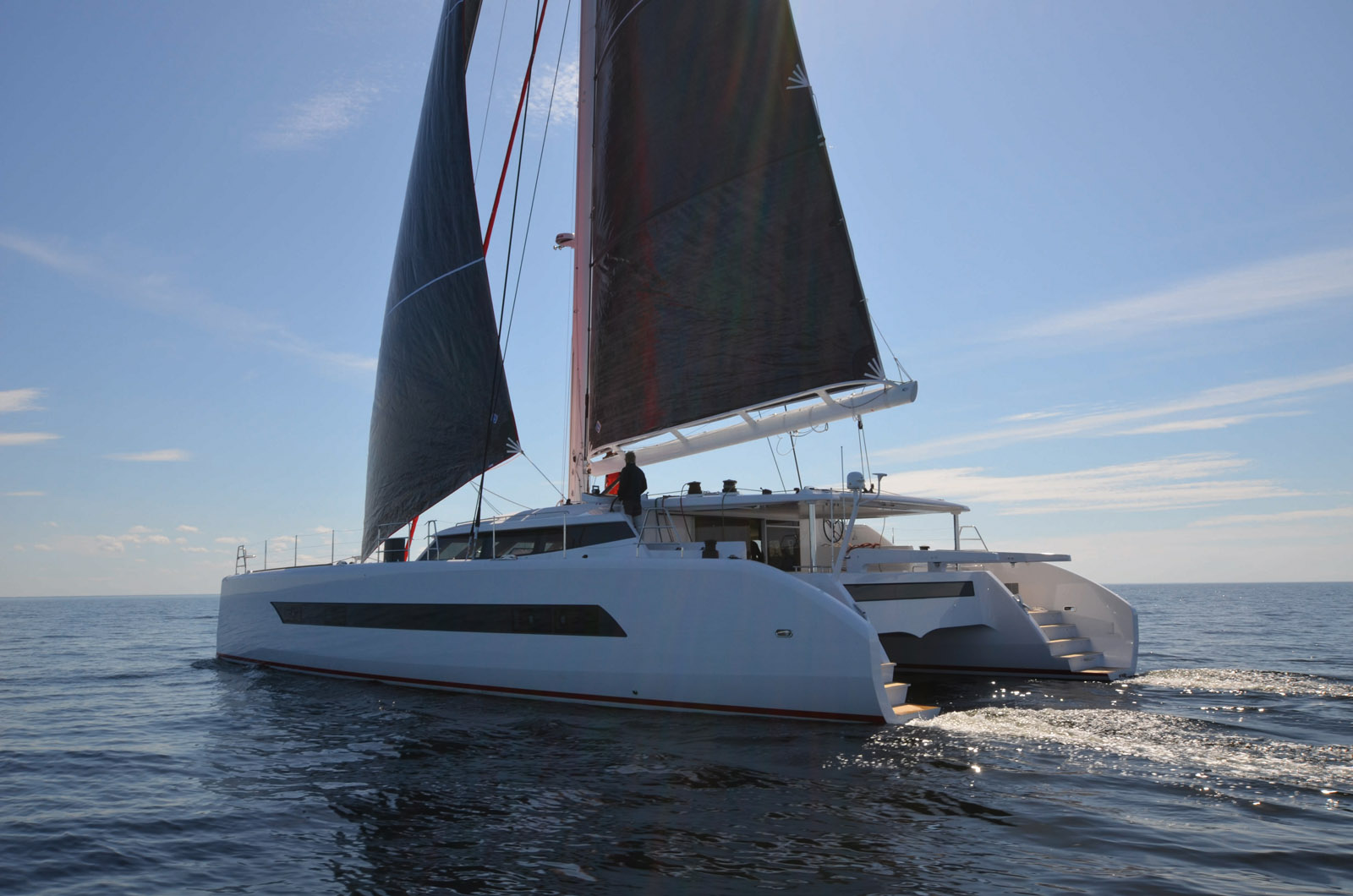 Pour notre premier essai sous voile, on relève une légère brise de huit à douze nœuds. Sur le pont, pas de surprise, ce sont les solutions largement éprouvées qui s’imposent, avec deux postes de barre à mi-hauteur de la casquette de roof. L’ensemble est traité façon superyacht avec des tambours avaleurs de drisse, des dévideurs anti-coques pour choquer les écoutes en toute quiétude, et bien sûr des winches réversibles. Le jeu de voiles Incidence DFI (292 m² au près) est superbement coupé pour répondre aux contraintes de l’engin et exploiter sa puissance. Les records de vitesse ne sont pas au programme ; l’idée est plutôt d’accrocher des moyennes journalières élevées et de faciliter l’ensemble des manœuvres. La grand-voile quitte sa bôme canoë ajourée pour se hisser rapidement. Pour tirer vers le large, Andrew, le skipper, envoie le gennaker. Le catamaran accélère et fabrique progressivement son vent, jusqu’à atteindre la vitesse du vent réel, soit 11,5 nœuds. Cette valeur flatteuse reste affichée sur le H5000 de B&G sans que l’attention des barreurs qui se relaient soit à son comble. Le mécanisme de barre par chaîne est un peu ferme ; quelques réglages sont encore nécessaires pour profiter d’une parfaite douceur. Andrew nous confirmera par la suite une vitesse de 15 nœuds dans 18- 19 nœuds de vent. Le retour au chantier impose du près ; d’une poussée de l’index, le déroulement du solent prend quelques courtes secondes. La pression d’un autre doigt fait plonger la dérive courbe (en profil d’aile d’avion) sous le vent. Sous GV et solent, à 28 degrés du vent apparent, nous regagnons la côte à 7 nœuds constants, alors que la brise est tombée… à 7 nœuds.