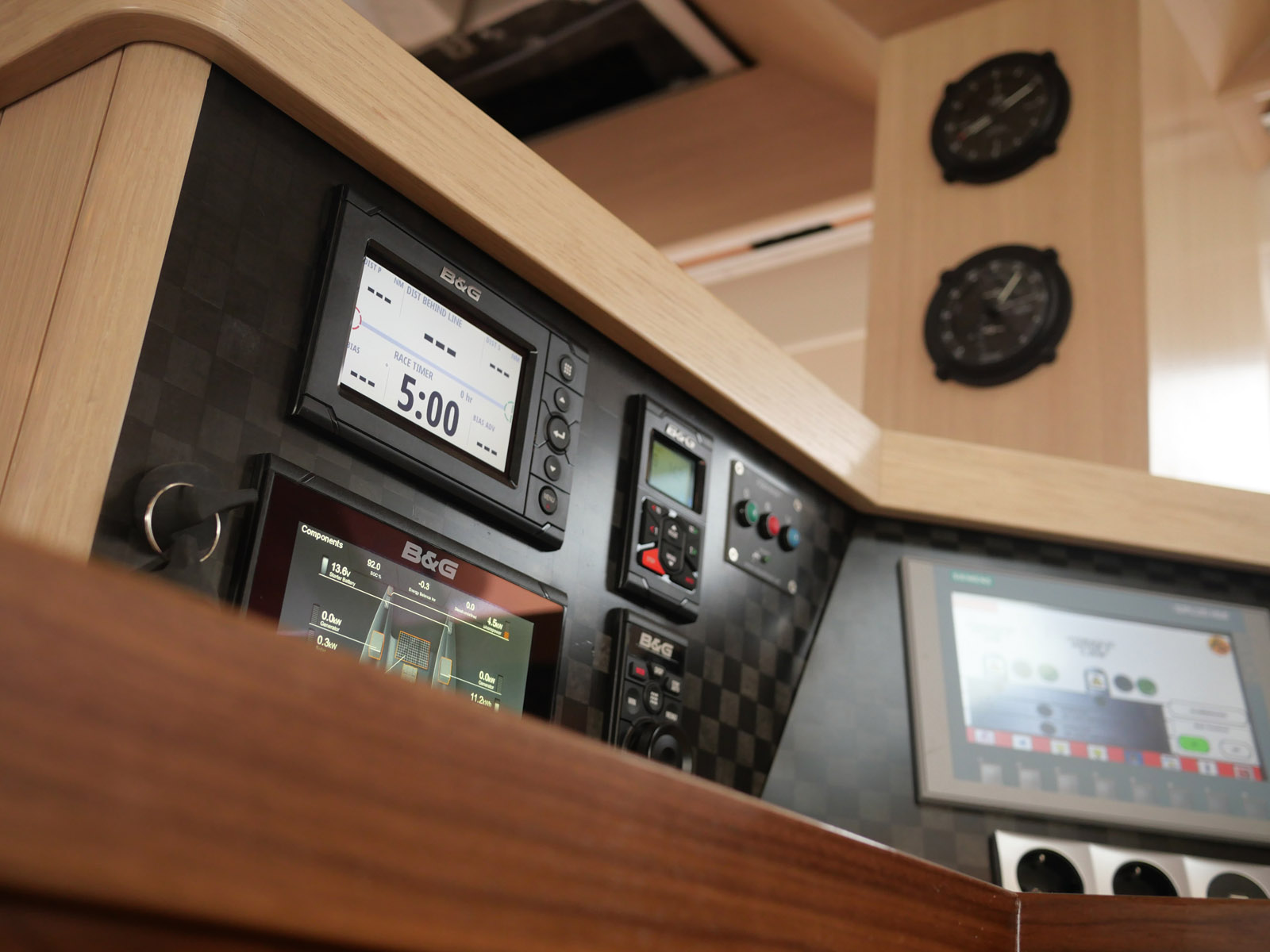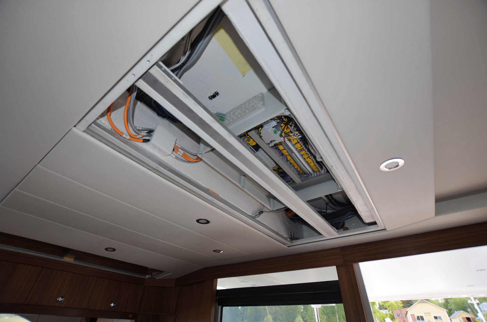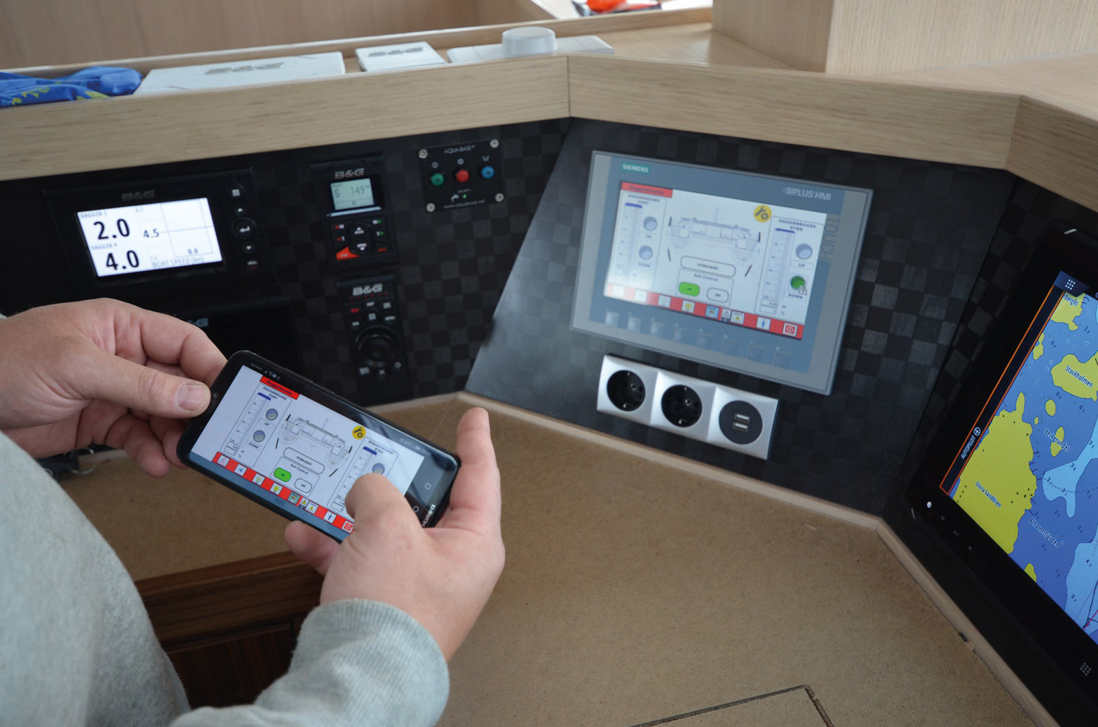 Le tableau de commande Siemens répond aux normes industrielles. Grâce à lui ou à l’interface smartphone, on peut commander l’ensemble du catamaran, comme ici pour les dérives. En cas de problème, la boîte à fusibles est directement accessible dans le plafonnier