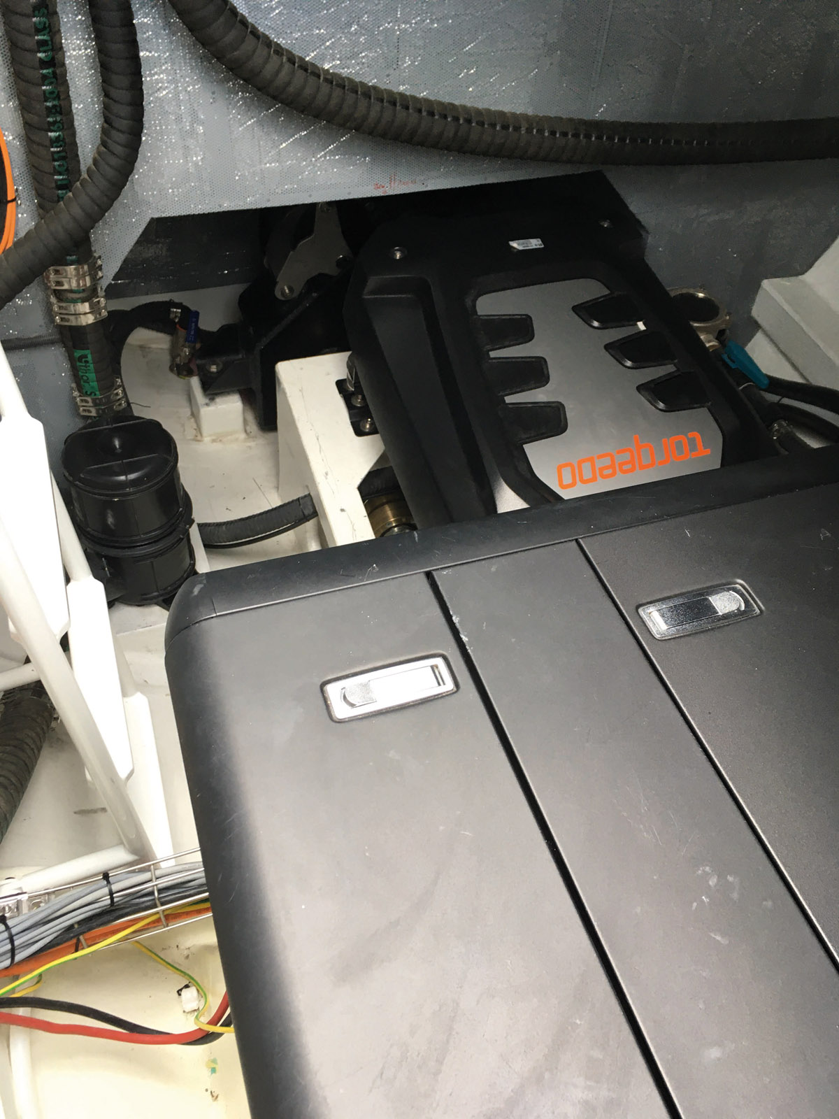 Les moteurs Deep Blue Torqeedo de 100 kW sont installés en avant des groupes. Plus à l’avant encore, la boîte de vitesses ZF permet de réduire les tours moteur de 2 400 à 800 tr/min, favorisant ainsi le couple et le ratio performance/consommation