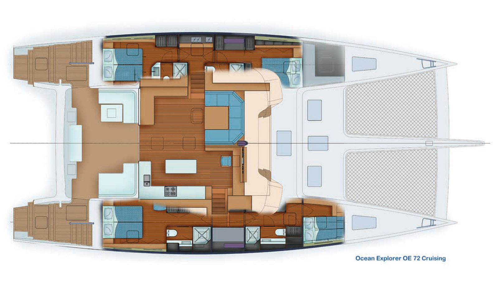 L’exploration des océans rapide, confortable et sereine, selon les souhaits du commanditaire, correspond en tous points à ce que les équipes conceptuelles et productives ont effectivement réalisé avec cet OE72. Ce luxueux catamaran s’apparente plus à du trois-quarts custom qu’à du semi. Cette limousine des mers particulièrement élégante garantit à son propriétaire des sensations de navigation et de vie à bord non encore explorées, tant la justesse et l’équilibre du concept sont inédits.