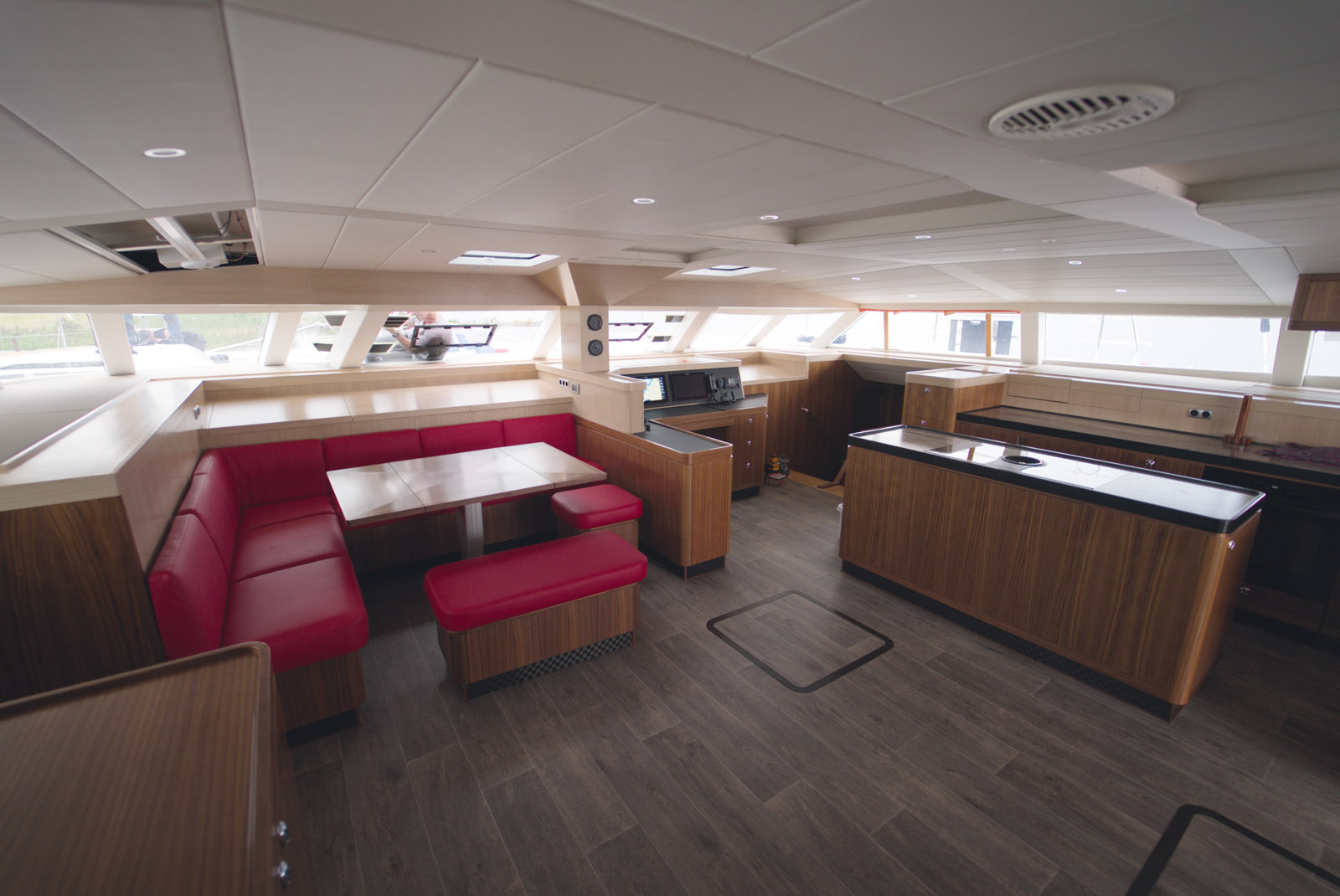 Le commanditaire européen, voileux irréductible ancien propriétaire d’un Catana 65, prévoit un long voyage autour du monde avec sa femme. Ne recevant ses enfants ou ses amis que lors de courts séjours, l’armateur sera accompagné d’un couple skipper/hôtesse afin de donner la part belle aux navigations à la voile. Les pics avant sont exclusivement réservés au stockage des voiles de portant. Un grand atelier pour l’entretien prend la place de la cabine équipage, mais pourra recevoir une couchette d’appoint pour un marin de passage. La cabine du skipper et de sa compagne est en fait une suite double disposée à l’avant du même flotteur que celle de la suite Propriétaire – qui, elle occupe, l’arrière sur sept mètres de long. Dans la coque opposée, deux suites invités très spacieuses, avant et arrière, sont séparées par de grands volumes de rangements. Le carré est intelligemment ouvert et modulable : à tribord se trouve la cuisine avec un îlot central ; elle est bien équipée et très pratique. La station de navigation est agencée à l’avant, avec un grand bureau. A bâbord, sur l’arrière, un grand volume (équipé d’une bibliothèque en L) est libéré afin d’optimiser la circulation et l’accès aux descentes cabines. A l’avant, une belle banquette en U fait office de coin apéritif et de repas pour six personnes selon le mode de réglage de la table. Mais ce plateau peut s’étendre sur la partie libre, et devenir une vraie table de banquet où une douzaine de personnes peuvent s’installer si besoin. Efficace et imparable pour la vie à bord au long cours. Les placages d’ébénisterie sont en noyer et en chêne pour le mobilier, et en teck pour les planchers cabine ; les modes passagères n’ont pas droit de cité ici…