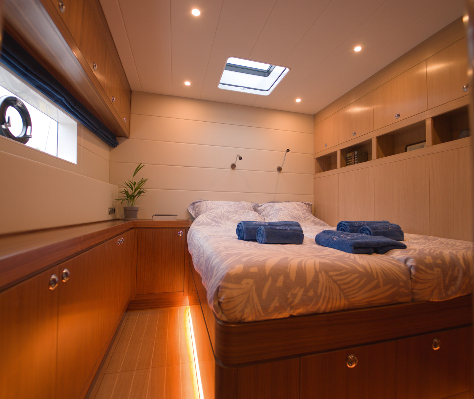Les quatre cabines sont de véritables petites suites, avec leur salle d’eau privative et d’immenses penderies. Les lits sont implantés en semi-îlot afin de libérer le passage.
