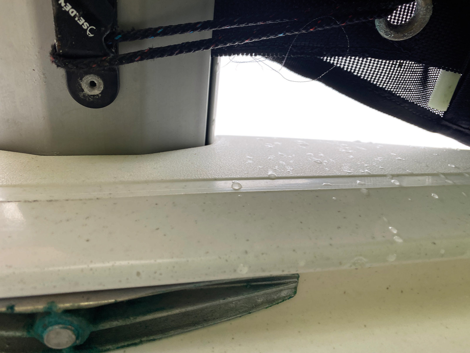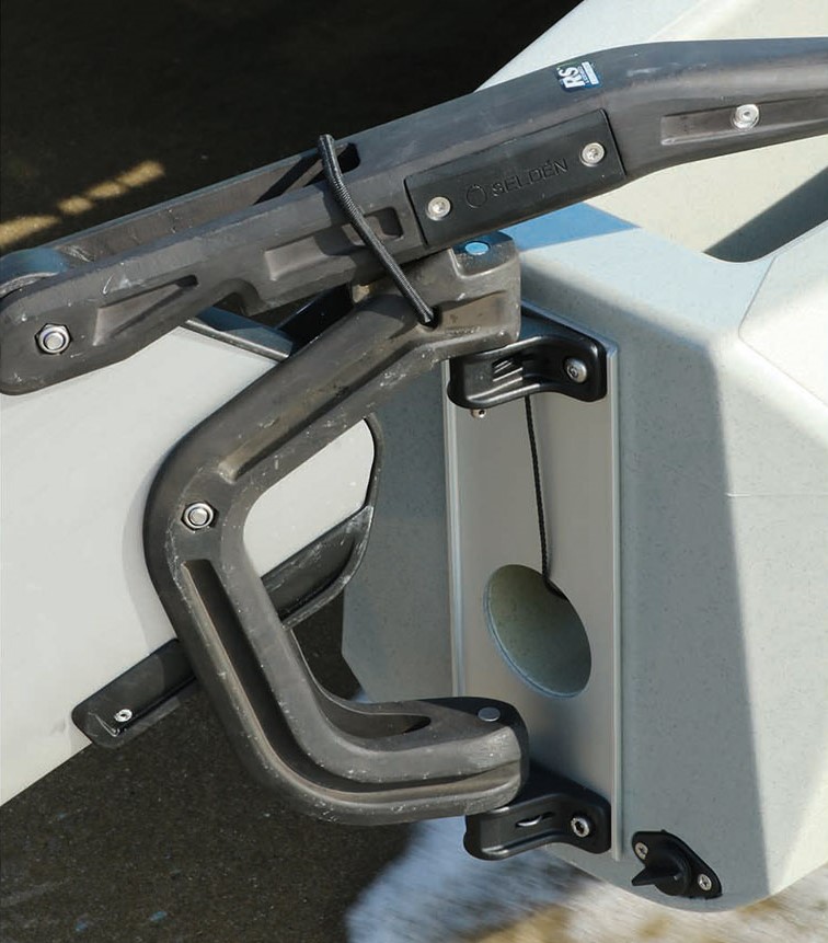 Le constructeur a opté pour le polyéthylène rotomoulé ; ce matériau est parfaitement adapté à la production en grande série et reconnu pour sa robustesse. Encore faut-il soigner le matériau et sa mise en œuvre. Ici, on n’a pas affaire à une simple couche peu armée face aux UV, à l’instar des annexes, mais à un véritable sandwich trois couches – la zone centrale est comparable à une mousse. Nous avons pu observer sur le terreplein du Yacht-Club de Carnac, à quelques milles de l’Ecole Nationale de Voile, quelques RS Cat 16 qui ont déjà bouclé cinq saisons : les coques ne sont pas déformées ; elles sont seulement abîmées sur le brion des étraves – inversées et très pincées, ces dernières sont durement sollicitées en usage école de voile « cata-tamponneur ». Les coques sont identiques, de telle sorte qu’une coque défectueuse peut facilement être remplacée. Le montage est particulièrement astucieux, puisque les poutres se fixent par un boulonnage très écarté – gage de rigidité – et surtout sur une lèvre extérieure à la coque, masquée par un élégant redan qui de plus rend la coque encore plus raide. Des pattes robustes en inox autorisent un bon serrage sans risque de déformer le polyéthylène. Il n’y a donc pas de trou dans la coque, d’écrous peu accessibles, de trappes et… de risques de voie d’eau. Idem pour les fémelots de safrans, directement accessibles par la face intérieure du tableau arrière. Précisons que les safrans en aluminium relevables automatiquement sont identiques à ceux du RS Cat 16. Le trampoline est tendu très facilement par un jeu de bouts et de taquets à l’arrière – le tout apporte de la rigidité en plus et un démontage toujours aisé.