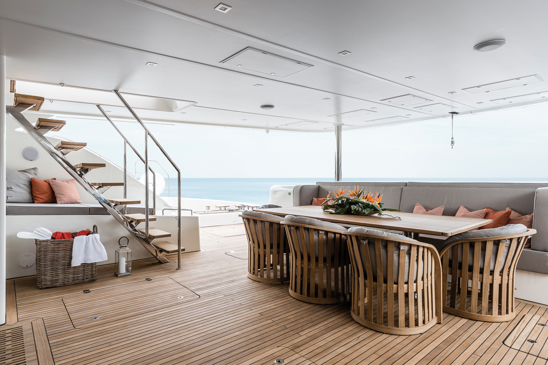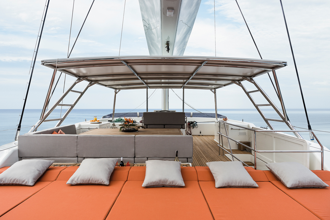 Depuis sa livraison en juillet, le bateau a déjà parcouru dix mille milles. Les deux Cummins de 425 CV déplacent l’engin à presque 10 nœuds en vitesse de croisière et en silence sur une distance transocéanique. Sous voile – le jeu fourni par Incidence, 460 m² au près et 680 m² au portant –permet de bonnes performances. Dans la légère brise du golfe de Saint-Tropez, en dessous de 10 nœuds réels, le bateau se déhale à 7 ou 8 nœuds, et dès que le vent monte un peu, il allonge la foulée. Avec 15 nœuds de vent, des moyennes à 11-12 nœuds s’effectuent dans un grand confort. Le triangle avant est composé d’un génois et d’une trinquette dont les efforts au point de drisse, implanté assez bas, sont repris par une paire de bas-haubans, autorise de naviguer par vent fort en toute quiétude. Leur maniement est assisté par des enrouleurs hydrauliques Bamar et des winches électriques Harken haut de gamme installés sur un piano regroupant toutes les manœuvres devant la barre du fly. La grand-voile lattée est stockée dans une bôme canoé en carbone fabriquée par le chantier, tout comme le mât.