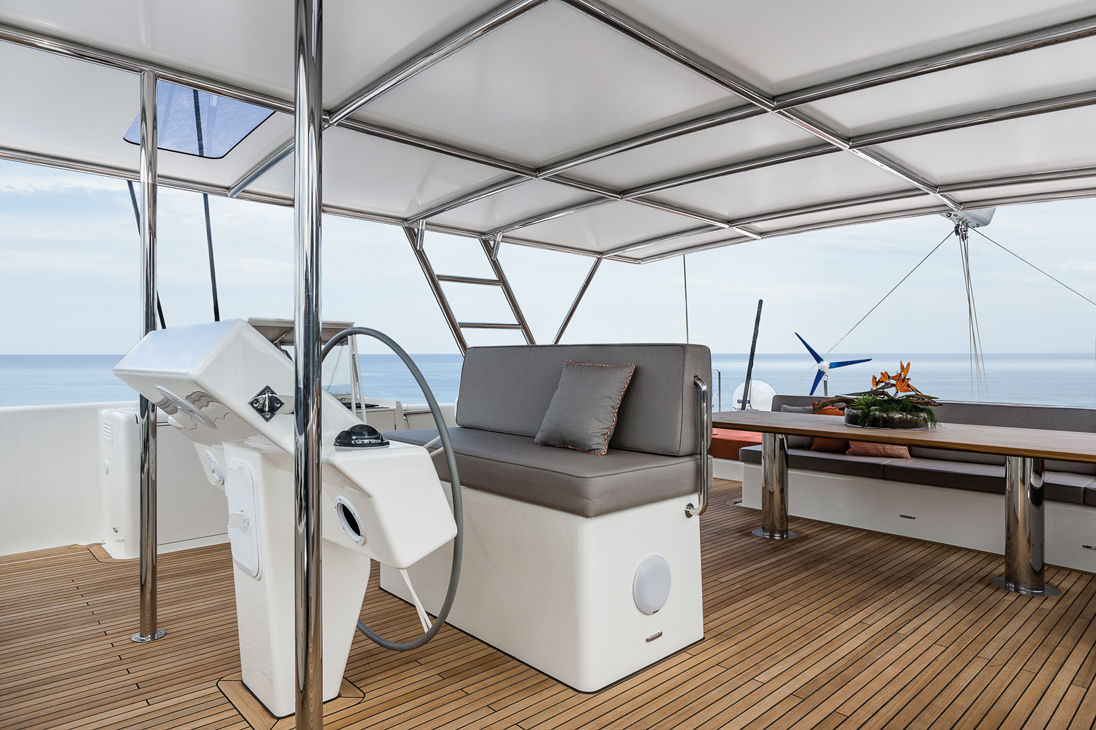 La construction a été très soignée, avec le choix d'utiliser le polyester pour les coques et le roof, et du carbone pour les renforts et les cloisons structurelles. L’ensemble du pont et du roof a été réalisé en une seule pièce. Le poids gagné avec cette méthode de construction permet de peaufiner les détails à l'intérieur : Afin de ne pas dépasser 45 décibels dans les cabines et d’obtenir une ambiance feutrée dans toutes les conditions, l’isolation thermique et phonique a été très travaillée. En exemple ? Les portes font 6 cm d'épaisseur, et tous les vitrages du roof ont été réalisés en verre double vitrage blindé… Pour parfaire l’installation, un circuit d’air pulsé basse pression distille une aération naturelle sur tout le bord, grâce à de nombreuses buses de ventilation mais aussi d’extraction. Très silencieux, ce système, que l’on peut brancher sur la climatisation réversible, garantit une température idéale avec de l’air toujours renouvelé. Le moindre détail a été prévu, anticipé pour un usage serein dans toutes les situations. Les toilettes de jour sont accessibles depuis le cockpit, sans qu’on soit obligé d’entrer dans le carré : très pratique au mouillage ou quand on descend du fly. Sur le fly justement, le ciel de toit du bimini rigide a reçu un traitement antireflet, et le grand bain de soleil arrière possède ses porte-bouteilles.