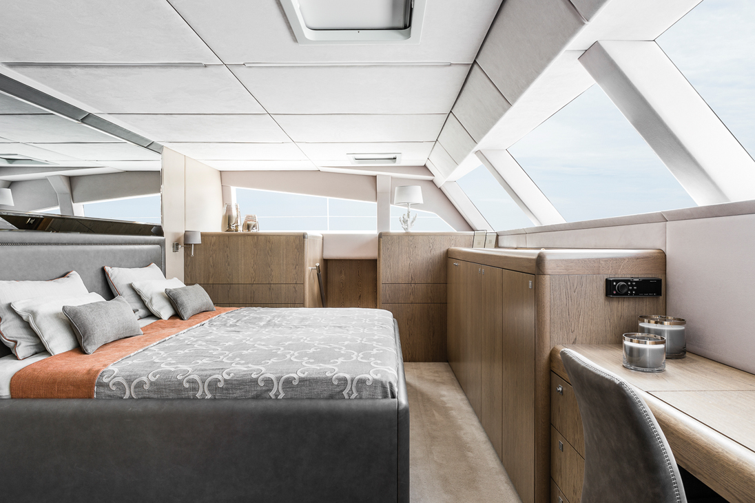 Le 82 DD étant jugé trop petit, décision est prise de dessiner un tout nouveau modèle. Le propriétaire veut quatre belles cabines avec salle de bain privative et un vrai quartier pour l’équipage, de multiples zones de vie et de détente, tout en préservant un look aérodynamique et une silhouette élégante. Le bateau sera donc un catamaran de 88 pieds en version double deck. Le volume habitable ainsi obtenu est bien plus important, et certaines astuces ont été utilisées pour l’augmenter encore. Dans le carré, le concept de double deck n’a été exploité que pour abriter la timonerie, faisant bénéficier le carré d’un très grand espace avec une hauteur sous barrot inégalée. Les jet-skis ont été placés dans une découpe de pont, moulée sur les passavants de chaque bord. La tonture inversée du pont a permis cette intégration tout en préservant le volume des cabines. Le garage arrière, ainsi libéré, est transformé en une belle cabine skipper avec sa salle d’eau indépendante et confortable. Les marins dédiés à l’hôtellerie bénéficient aussi d’une suite, cuisine-cabine twin, très adaptée pour effectuer un service irréprochable sur de longues périodes et dans de bonnes conditions. La cabine propriétaire à l’avant bénéficie d’une vue à 180°. Les 3 cabines invités sont vraiment très spacieuses, avec dressing intégré. Cette disposition est, somme toute, assez classique pour une unité de cette taille. Mais la réalisation du chantier – reprenant les idées des propriétaires –, sous la supervision du skipper, est particulièrement homogène. Cet aménagement permet de décupler le bien-être à bord, quelle que soit la durée de la navigation ou du séjour.
