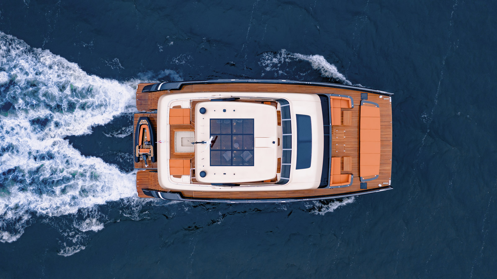 Les surfaces dédiées à la détente sont immenses. A l’avant du rouf comme à l’arrière sur le flybridge, de multiples assises et bains de soleil s’offrent aux invités. Quant à l’annexe, elle peut emmener dix personnes facilement.