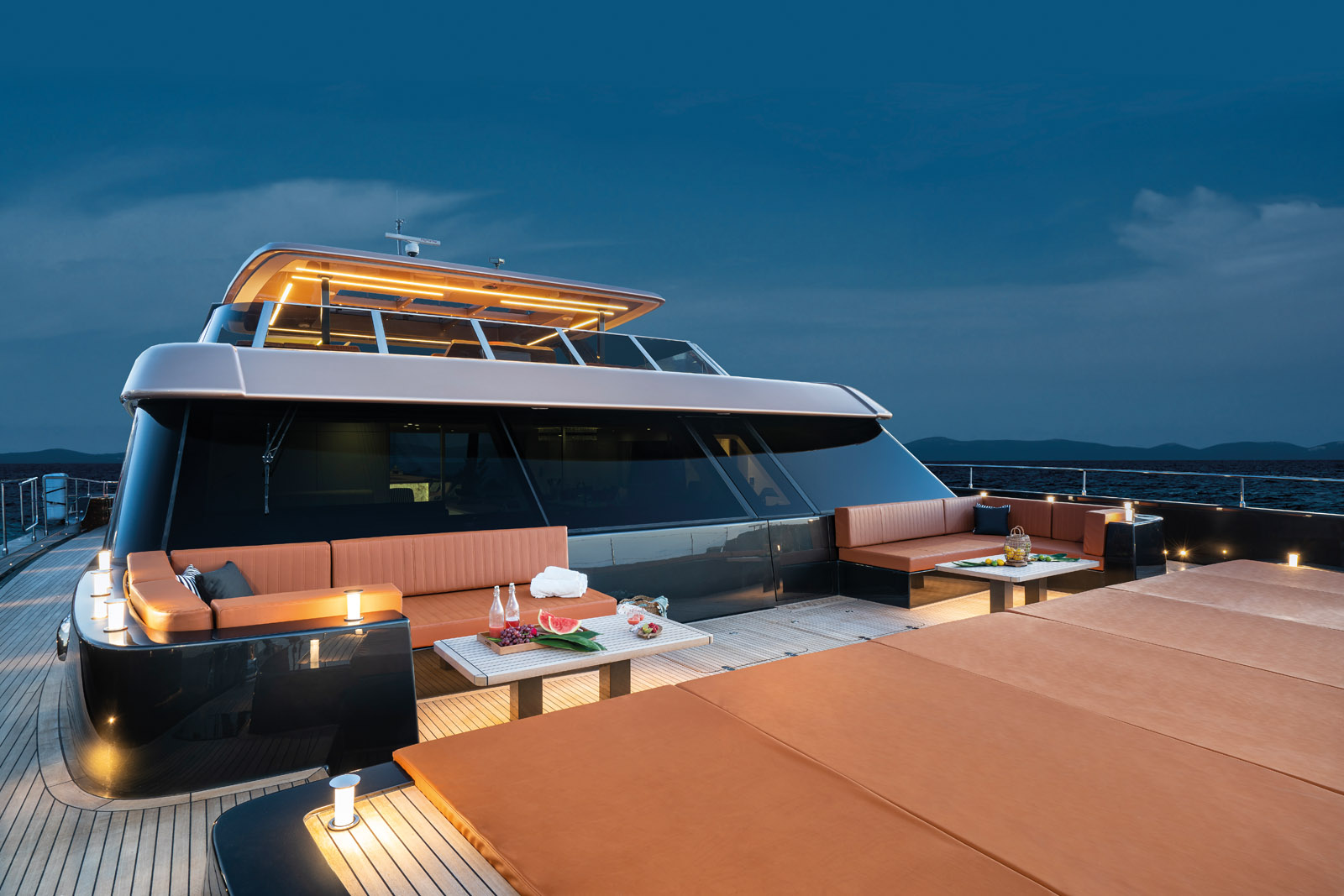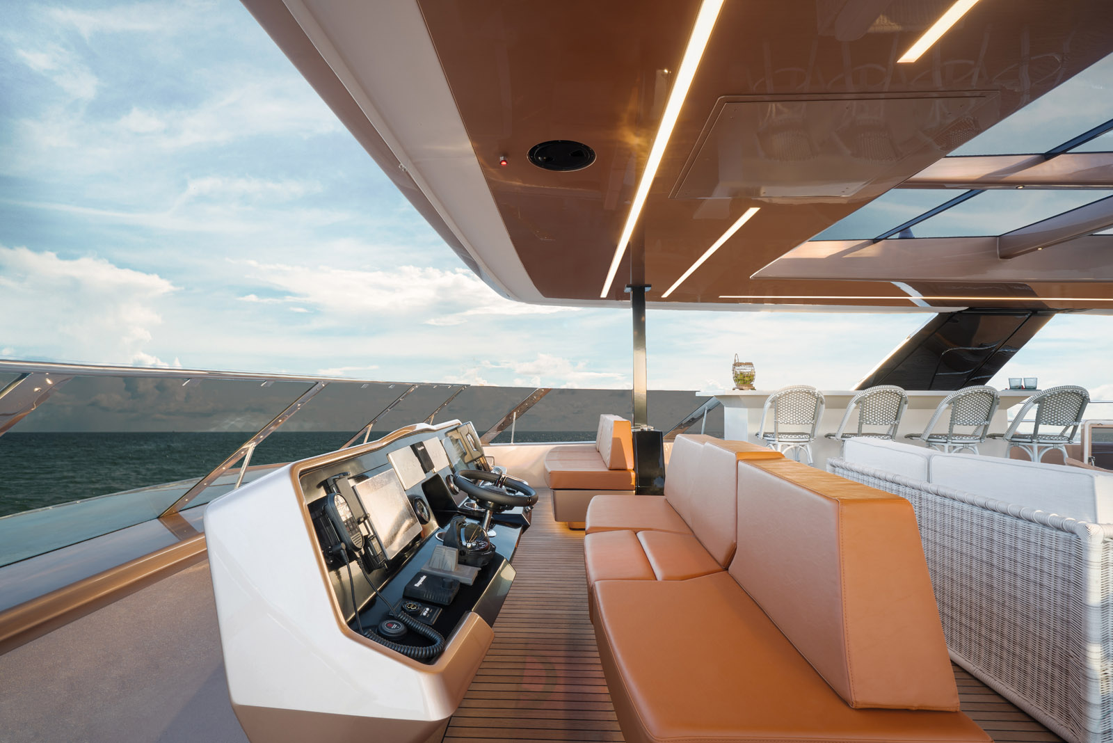 Le flybridge abrite un bar, un salon, une grande table pour dix ou douze personnes, un jacuzzi, un bain de soleil – et il y a encore de la place pour danser.