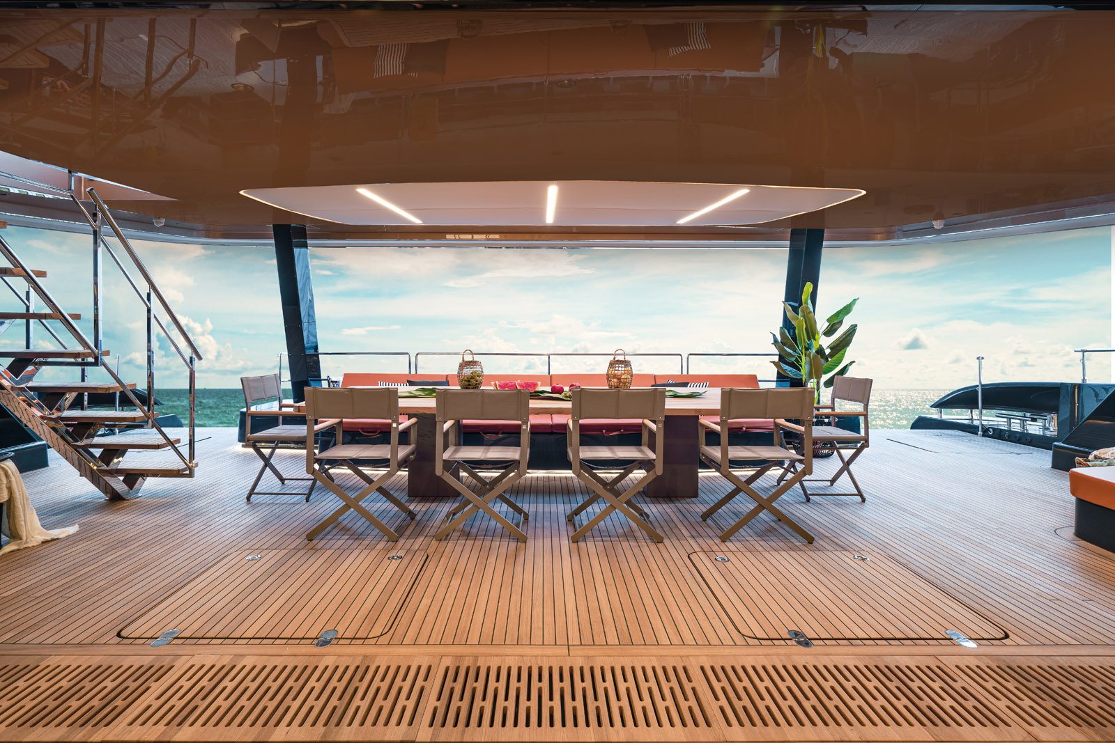 Le cockpit arrière est pourvu d’une très grande table. Sous le grand bain de soleil, un garage accueille deux jet-skis trois places, une station essence et des jouets nautiques.