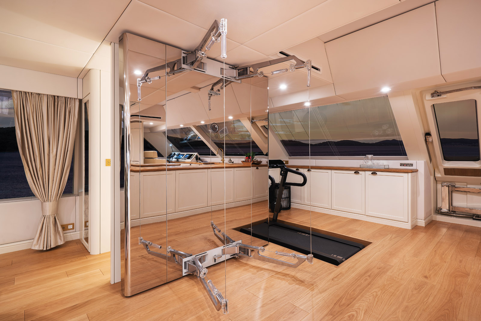 La salle de gym est sur la partie avant du salon, face à la mer. Pour limiter les effets d’un éventuel roulis, le tapis de course est perpendiculaire à la marche.