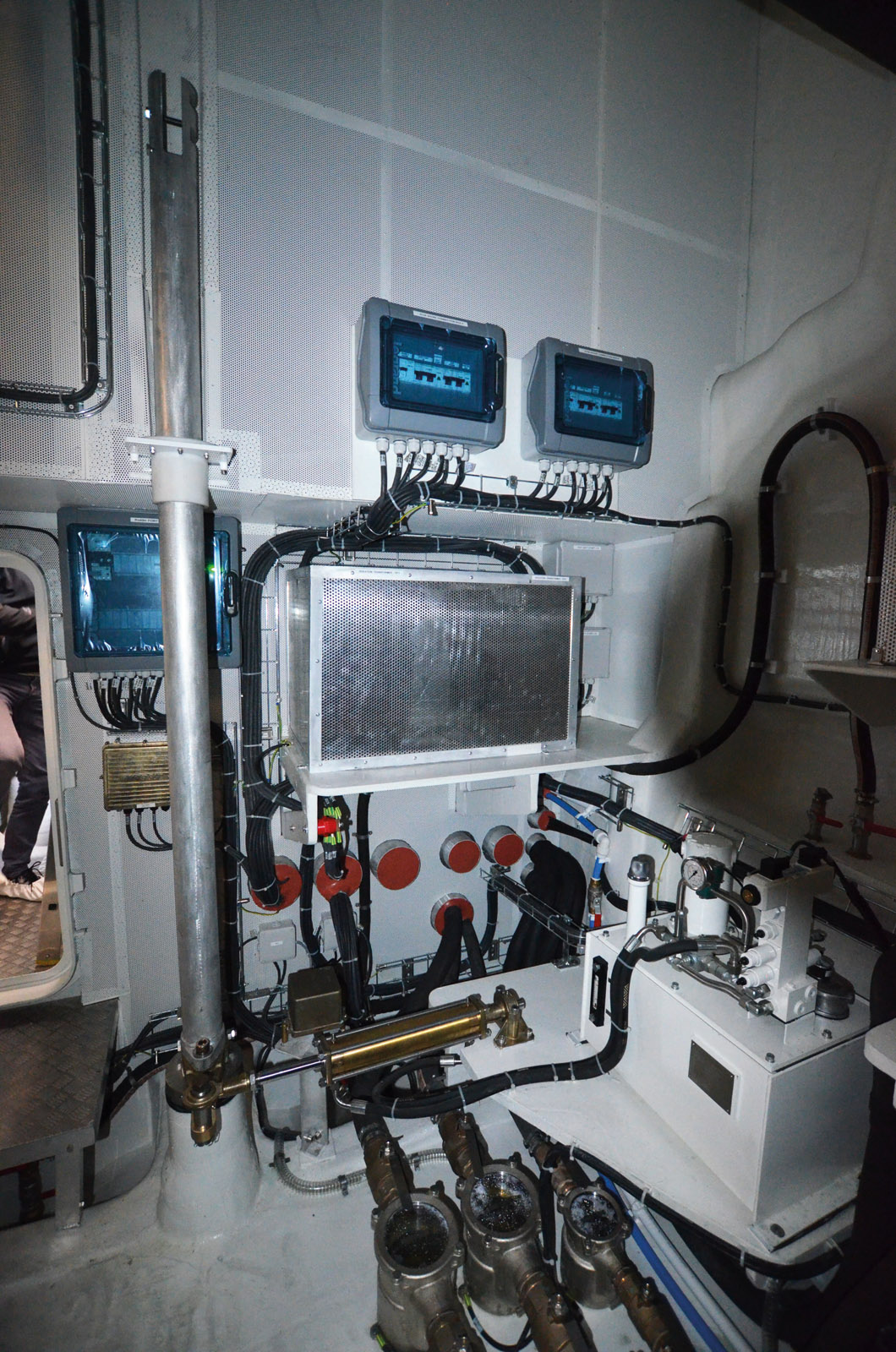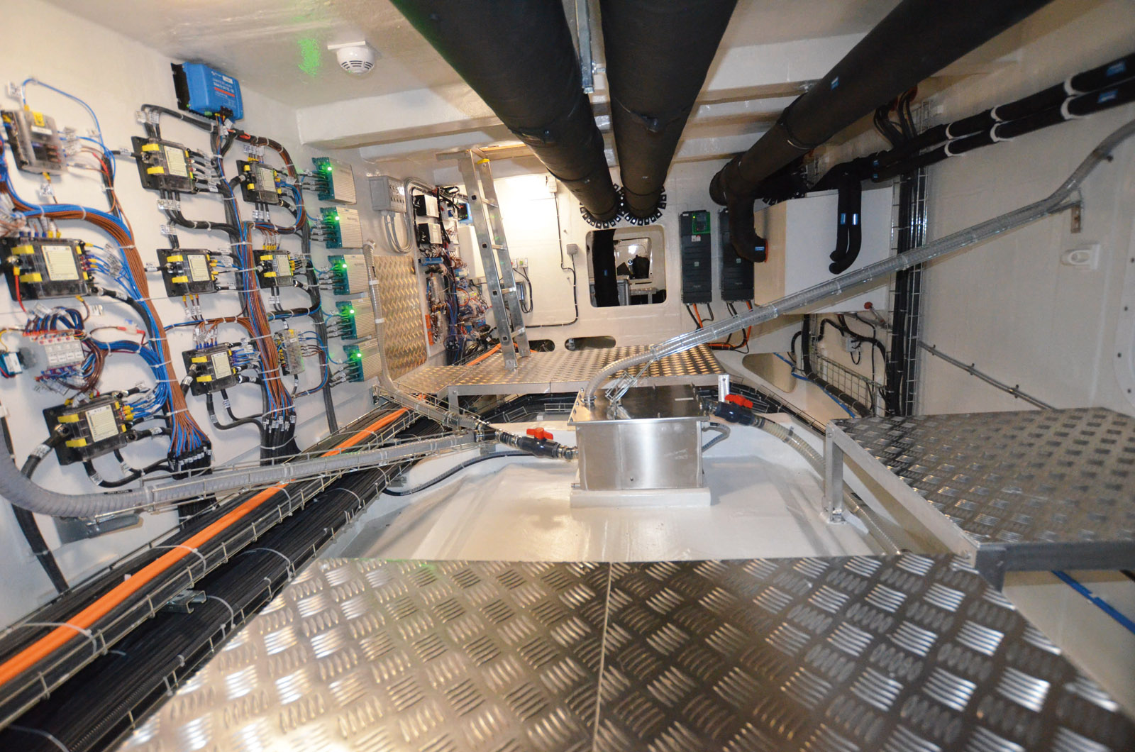 La galerie sous le pont principal donne accès à tous les organes techniques. Le niveau de finition est en nette amélioration, et on peut y accéder partout à bord depuis des trappes réparties sur le plancher. Le secteur de barre est situé en arrière d’une cloison étanche, avec les générateurs. La hauteur du compartiment – 3 mètres – est impressionnante.