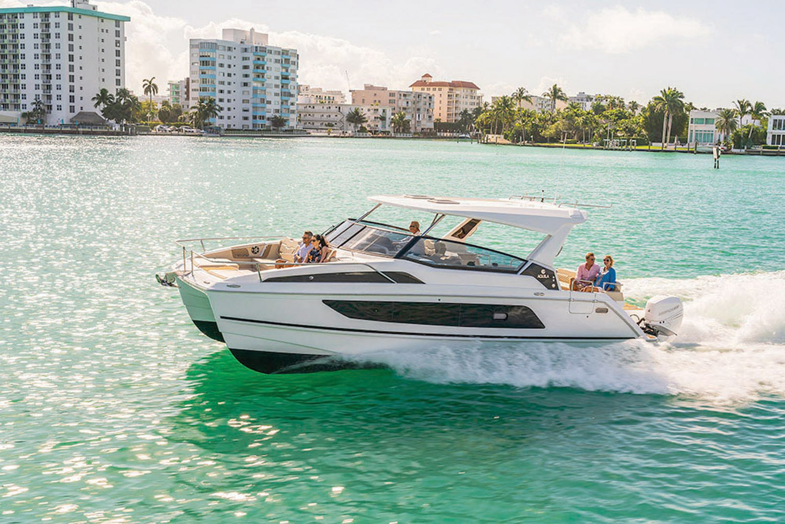 Le design extérieur est guidé par la volonté de disposer d’un espace le plus ouvert possible tout en assurant une protection si les conditions venaient à se gâter. Deux versions sont disponibles : Open avec sautevent et T top monté sur arceaux, et Coupé Sport avec pare-brise intégral. On peut ensuite équiper le hard top d’une capote souple coulissante. Il est également possible de fermer le pilot house à l’arrière avec une cloison souple amovible. Pour la petite croisière, une baie vitrée coulissante peut fermer complètement cet espace. On note que le constructeur a fait l’impasse sur les passavants – pour gagner l’avant, on passe par l’intérieur, comme nous le verrons plus loin.