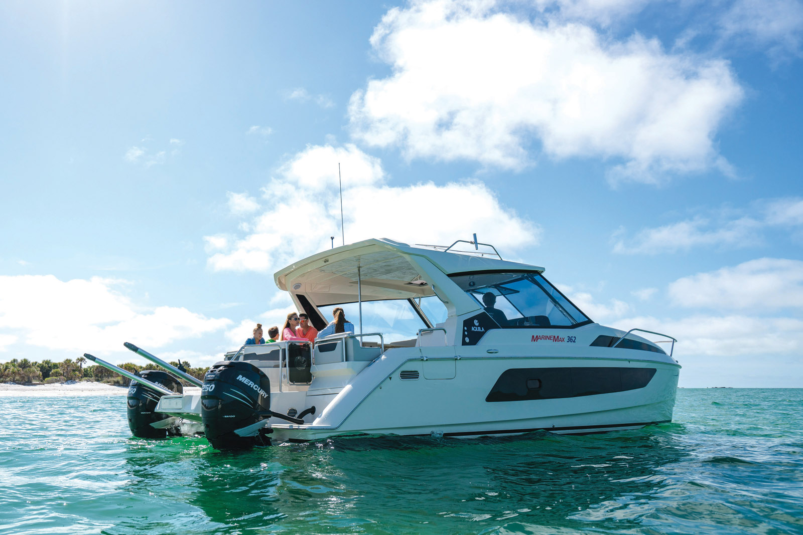 La marque Aquila s’est taillé une belle part de marché aux EtatsUnis. La gamme de 32 à 48 pieds, développée en partenariat avec le loueur MarineMax, fait les beaux jours des bases de location américaines. Certains modèles ont été renommés du nom du loueur. Le 36, par exemple, devient le MarineMax 362 – on connaît la formule avec d’autres grands loueurs. Récemment, Dream Yacht Charter a commandé de nombreux modèles et a pris la distribution pour la France avec son enseigne Dream Yacht Sales. Le 36 a spécialement été développé dans l’optique d’une propulsion hors-bord. Avec cette longueur de 36 pieds, cette formule de motorisation est convaincante en termes de souplesse d’utilisation et d’entretien. Les carènes, signées J&J Design, dévoilent des redans particulièrement optimisés. Pour une légère sustentation et une meilleure tenue en courbe, un aileron central reliant les deux coques sous la flottaison est proposé en option. Notre modèle d’essai n’en était pas équipé.