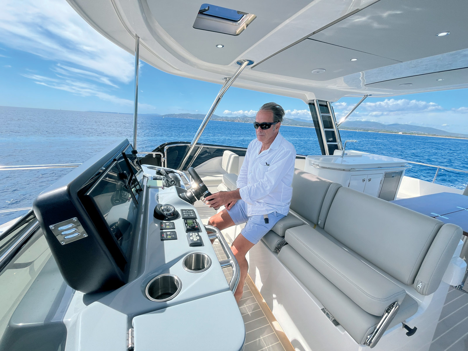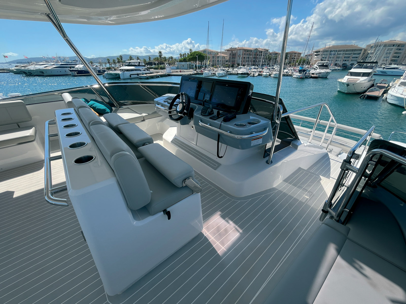 Puisque que l’on parle du flybridge, le point important est le réaménagement sur tribord d’un second accès sur la plage avant. Cette découpe permet d’avancer le poste de pilotage central au plus près du saute-vent, et ainsi de bénéficier d’une surface plus grande à l’arrière. On y découvre une très grande table avec sa banquette en L qui fait face à une cuisine bien équipée – elle comprend un gril, le tout est abrité sous le hard-top évoqué plus haut – et une belle surface de farniente avec un grand bain de soleil et de quoi poser ses gobelets. La palme revient néanmoins aux deux méridiennes qui entourent le poste de pilotage, une double à bâbord et une simple de l’autre côté du passage. La circulation entre les deux escaliers en enfilade ne perturbe d’ailleurs absolument pas les invités. La plage avant est équipée d’un immense bain de soleil qui se transforme en méridienne et en petit salon avec les banquettes qui recouvrent la proue.