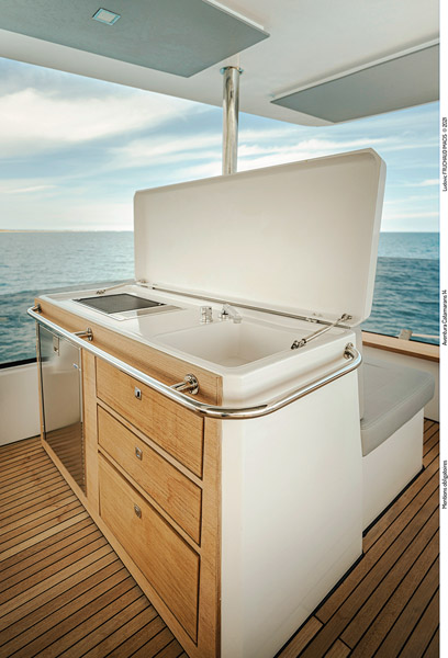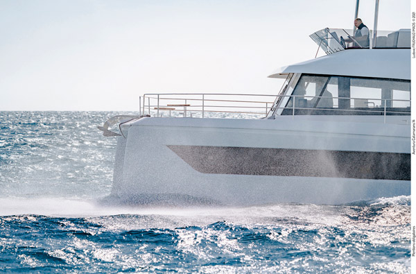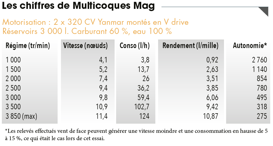 La coque et les superstructures en sandwich mousse/polyester inspirent confiance : l’absence de vibration à l’impact des vagues semble confirmer les aptitudes pour les grandes navigations du 14. Avec un déplacement de 30 tonnes en ordre de marche, nous sommes plus en présence d’un trawler que d’un powercat rapide. Le cahier des charges initial correspond plus à s’embarquer dans une possible transatlantique plutôt que de battre des records de vitesse. Notre catamaran d’essai était équipé de la « petite » motorisation de deux fois 320 CV, montée en V drive avec des hélices à quatre pales – elles mériteraient un diamètre légèrement supérieur. Dans un vent de 15 à 20 noeuds et une mer agitée, nous avons croisé entre 9 et 10 noeuds. Le maxi s’est établi à 12 noeuds, mais, dans de bonnes conditions, on peut espérer deux noeuds de plus. Le niveau d’insonorisation des cales moteur est incontestablement un point à améliorer pour matcher avec le niveau général. Pour aller un peu plus vite, des Yanmar de 440 CV sont proposés, mais à quoi bon ? Gagner deux ou trois noeuds ne change pas drastiquement la donne et, de toute façon, ce que veulent les utilisateurs consiste plus à pouvoir vivre tranquillement à bord plutôt que de devoir subir les remous intempestifs liés à une vitesse de quinze noeuds ou plus. La timonerie intérieure est un poste de navigation très confortable, debout ou assis, pour faire de longues veilles sans être séparé du reste de l’équipage. Depuis le fly, la vision sur le plan d’eau est royale. A plus de 9 noeuds, la consommation s’établit à 50 litres/heure, mais, en descendant à 6,5 noeuds, 14 litres/heure suffisent à satisfaire l’appétit des Yanmar. Rappelons que nos conditions face au vent étaient difficiles. Le chantier a prévu un réservoir optionnel de 1 000 litres supplémentaires portant à 4 000 litres la contenance en carburant. Les grandes traversées sont donc envisageables, avec une autonomie supérieure à 2 000 milles.