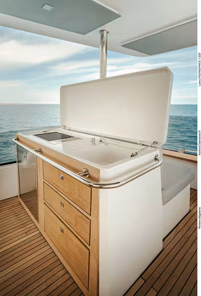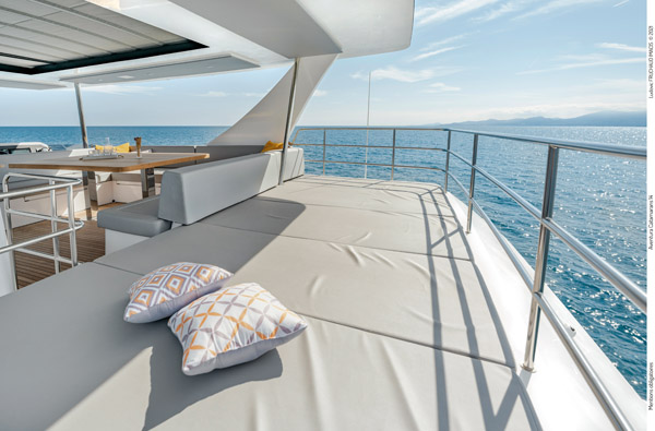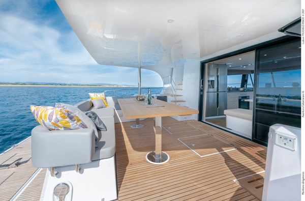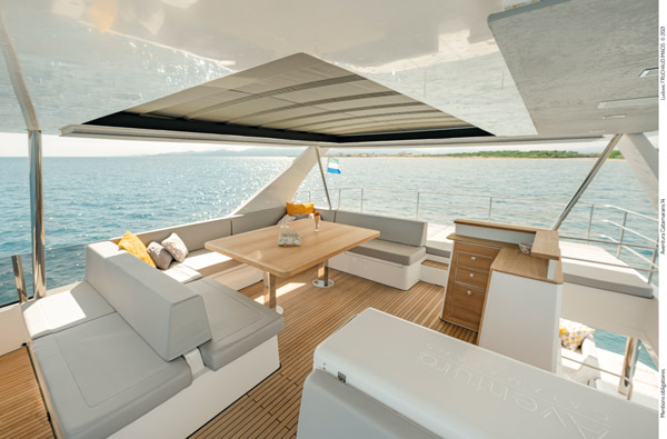 Le cockpit arrière communique bien avec le salon intérieur. Tout est dimensionné pour recevoir de nombreux invités dans les meilleures conditions de confort.